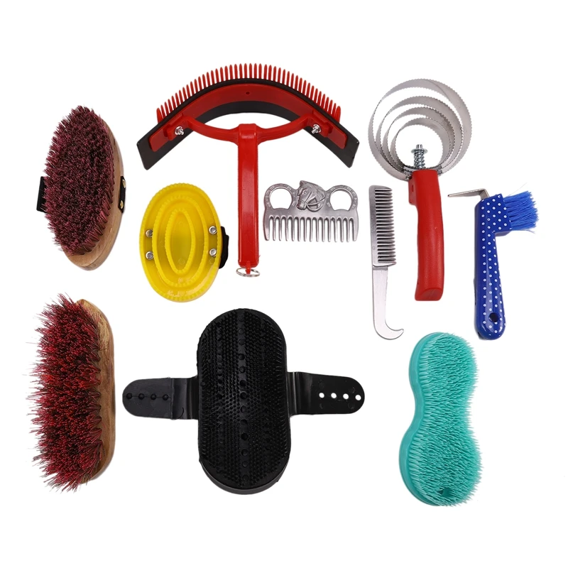 10-в-1 инструмент для ухода, в том числе: Овальный массаж карри, жесткая и мягкая щетка, контурный пот scrapper, гребень для гривы, гребень для хвоста, копыта с щеткой, гребень для весны карри, желе скруббер и карри расческа.
