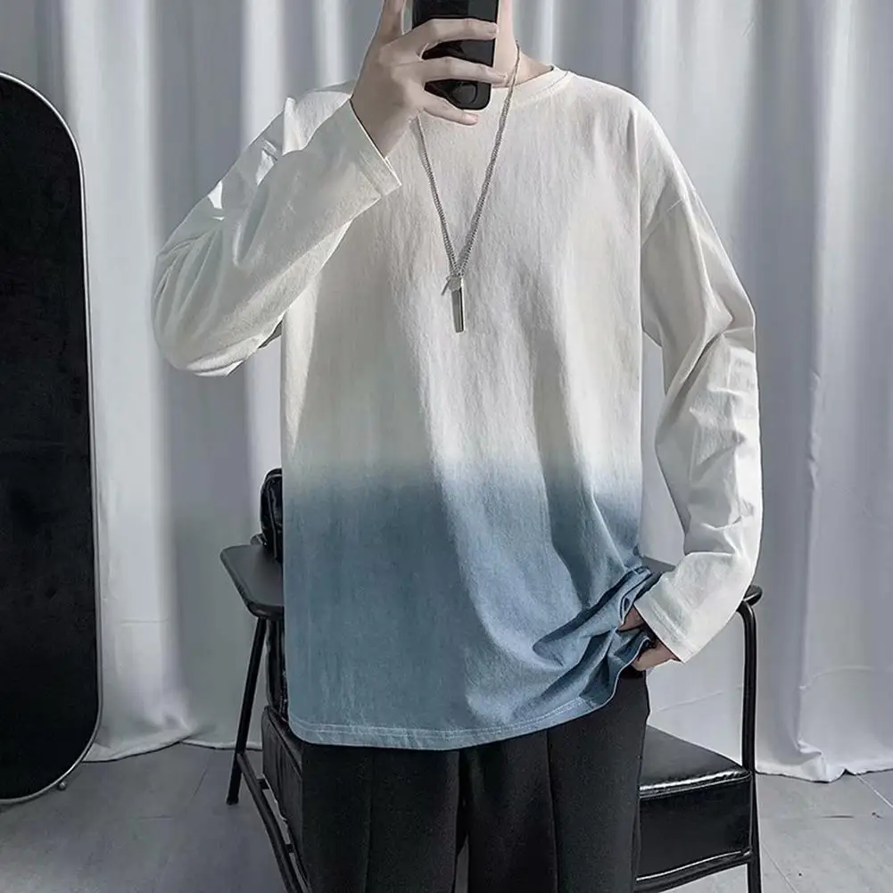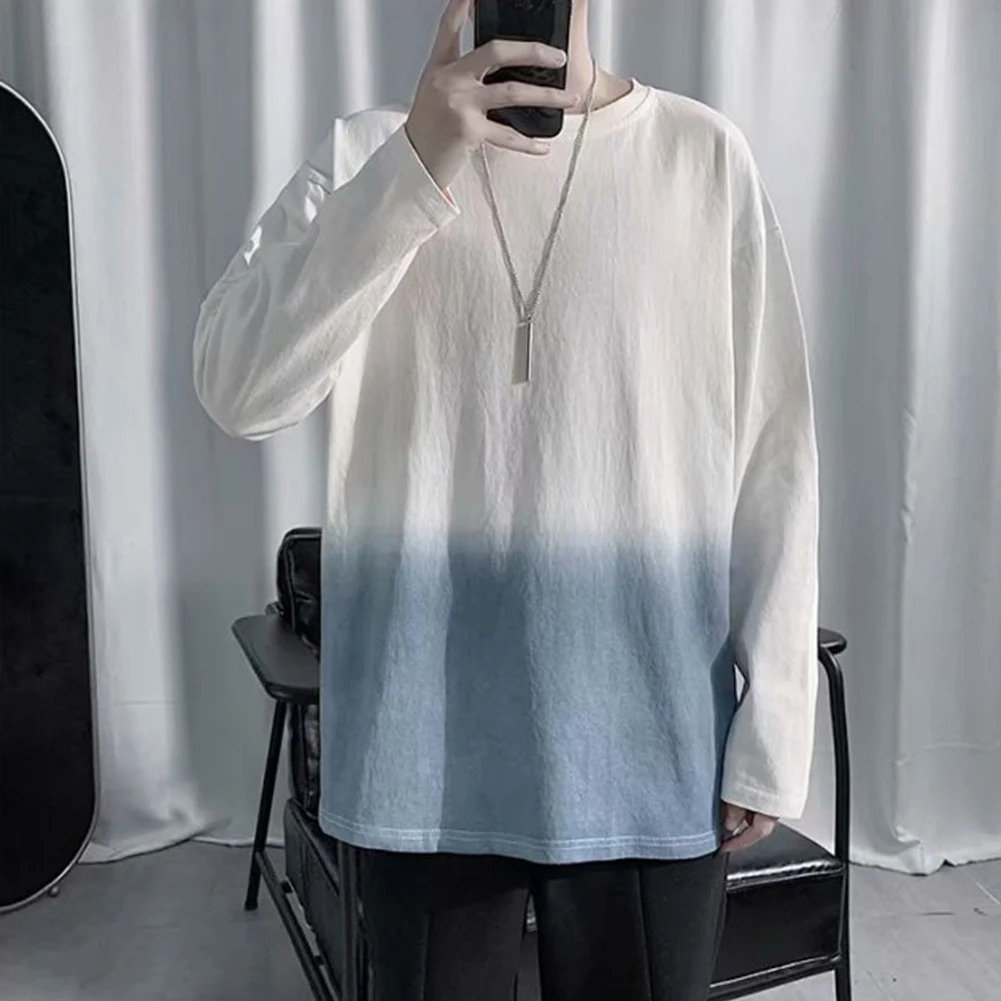 Модная мужская Свободная футболка с градиентом и длинным рукавом с круглым вырезом