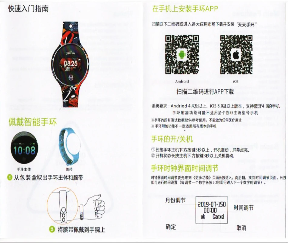 Выньте корпус браслета и браслет из коробки Wear Наденьте браслет на запястье Установите приложение для браслета на свой телефон Отсканируйте qr-код ниже или перейдите на основные рынки приложений для загрузки и установки «Tiantian Bracelet» Android Ios Отсканируйте qr-код для загрузки приложения Системные требования: Andriod 4,4 и выше, ios 8,0 и выше, мобильные телефоны с поддержкой Bluetooth 4,0 Дополнительные особенности браслета могут не применяться к некоторым неосновным моделям Все тестовые данные морского браслета только для справки и не могут быть использованы в каких-либо медицинских целях ※Дополнительные функции браслета не могут быть применимы ко всем версиям мобильных телефонов Включение/выключение браслета ①Удерживайте кнопку под основным корпусом браслета более 3 секунд, ботинок вибрирует, и экран загорается. ②Удерживайте кнопку под основным блоком более 3 секунд в режиме включения питания, режим отключения питания вибрирует. Настройка времени интерфейса часов браслета Чтобы отрегулировать время работы интерфейса часов, сначала перейдите на страницу «больше функций» и нажмите и удерживайте нажатой, затем прокрутите назад, чтобы найти страницу настройки времени, Вы можете установить время (каждый раз, когда вы настраиваете цифру, нажмите в течение 12 секунд, чтобы ввести следующую регулировку цифр). Настройка месяца 2019-07-150 Регулировка времени 00:00 Ok canxel Определять Отменить