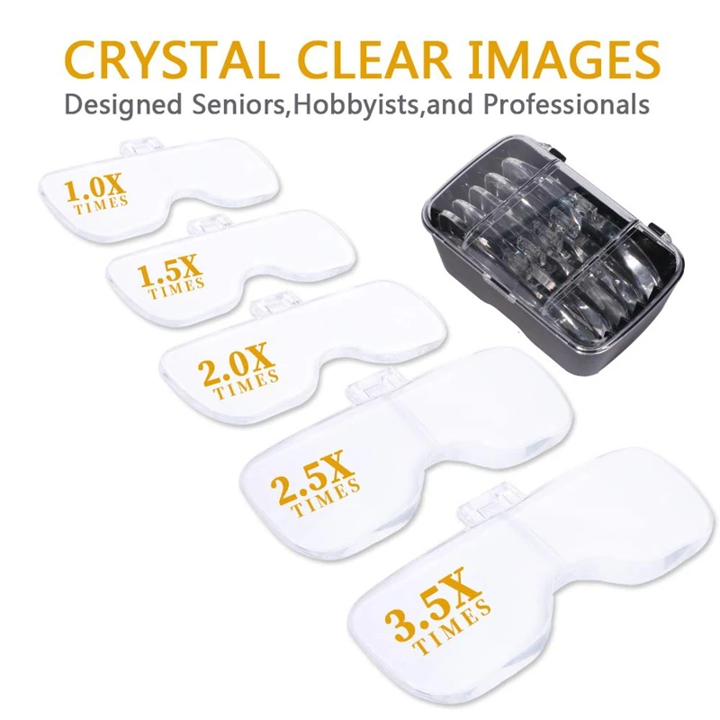 5 различных линз для близкой работы: оголовье nifier glasses обеспечивает пять nification 1X, 1.5X, 2X, 2.5X, 3.5X. Размер объекта можно наблюдать, чтобы выбрать необходимые линзы, такие как шитье, работа с иглой, вязание, вышивка крестиком, вышивка и т. Д.