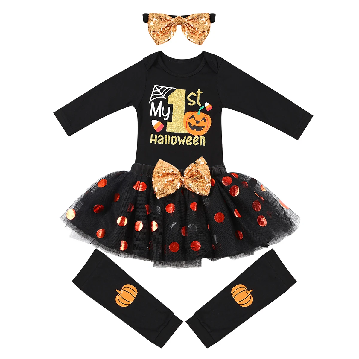 Подходящая повязка на голову; Гетры с рисунком тыквы; Эластичная сетчатая юбка-пачка с бантом с пайетками спереди. Очаровательный и милый комплект для вашей девочки.
