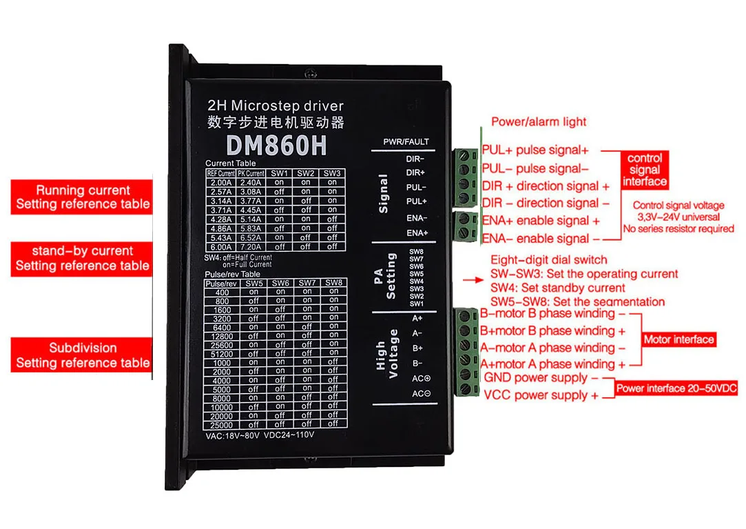 Тип товара: привод шагового двигателя Напряжение питания: DC24-110V или AC18-80V Ток вождения: 2,4-7.2A Ход деления: 2-200 Оптически изолированный сигнал Вход Двигатель Шум оптимизация Может управлять любого 2-х фазный, большие размеры 34-фазный шаговый двигатель ниже 7.2A 20 кГц разделочная частоты