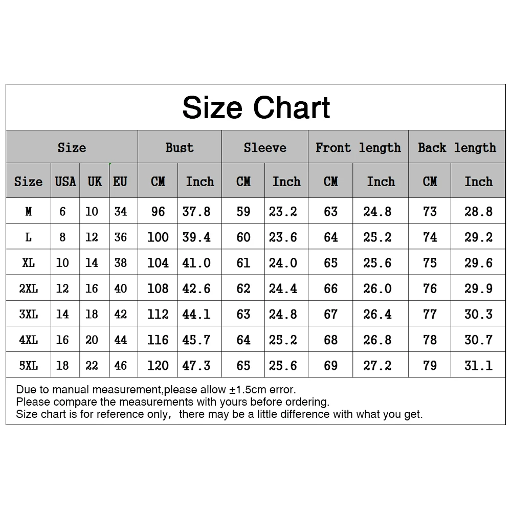 [Наш Размер 5XL] Обхват груди: 120 см/47,2 дюйма, рукав: 65 см/25,6 дюйма, длина спереди: 69 см/27,2 дюйма, длина по спинке: 79 см/31,1 "(прибл.)