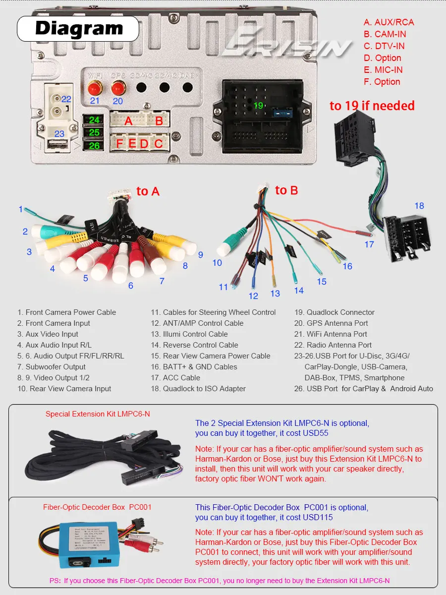 -Функция: может быть подключен к U-диску, ключу 3G/4G, ключу CarPlay, устройству TPMS, DVR-камере, DAB + Box, смартфону и т. д.