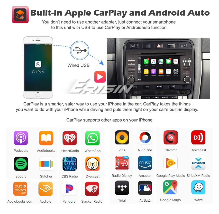 -Встроенный автоматический модуль Apple CarPlay и Android. Вам не нужно использовать другой адаптер, просто подключите ваш