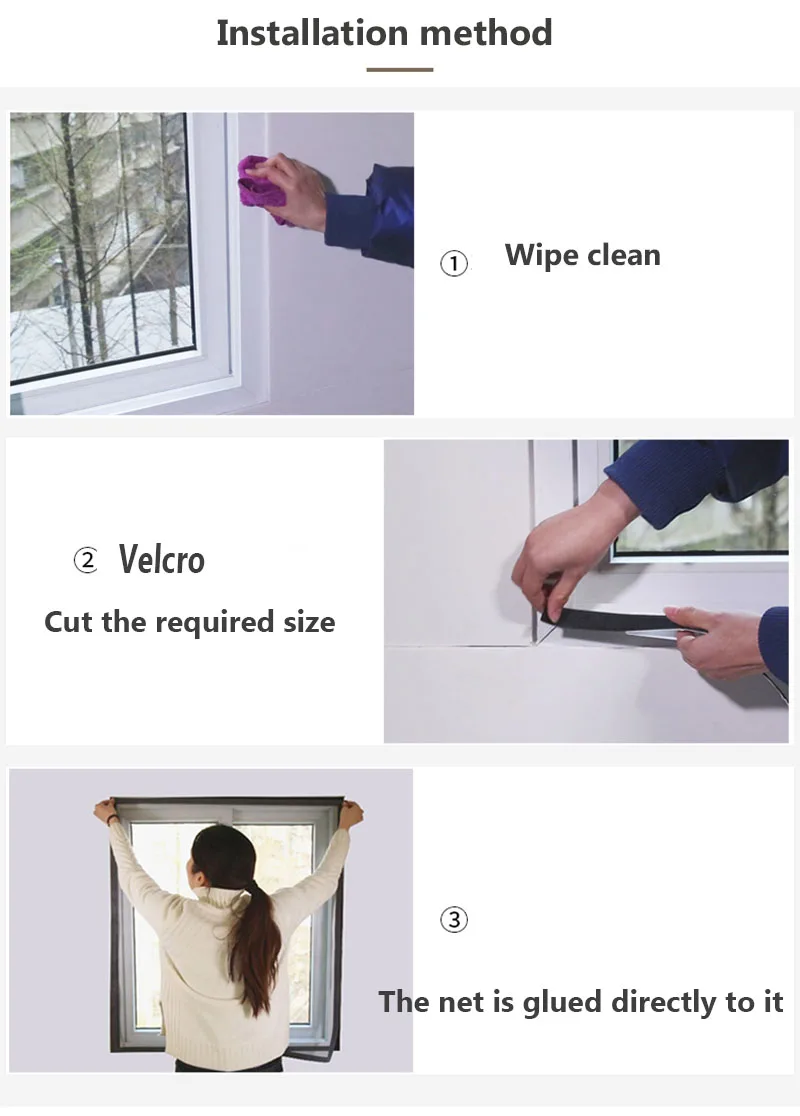 В комплект входит: 1 шт. экрана от насекомых на окно, 1 рулон самоклеящегося крючка и липучка на ленте