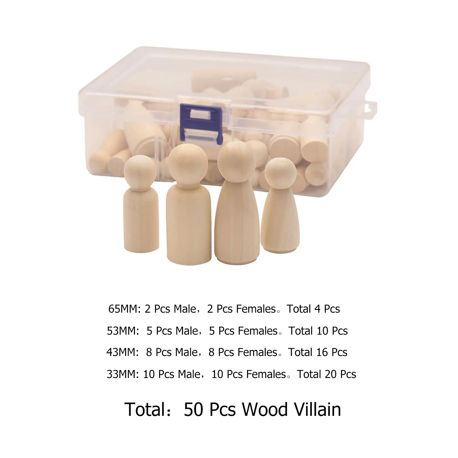 65 мм: 2 шт. мужской, 2 шт. женский. Всего 4 шт. 53 мм: 5 шт. для мужчин, 5 шт. для женщин. Всего 10 шт. 43 мм: 8 шт. мужчин, 8 шт. женщин. Всего 16 шт. 33 мм: 10 шт. для мужчин, 10 шт. для женщин. Всего 20 шт. Всего: 50 шт. деревянный злодей