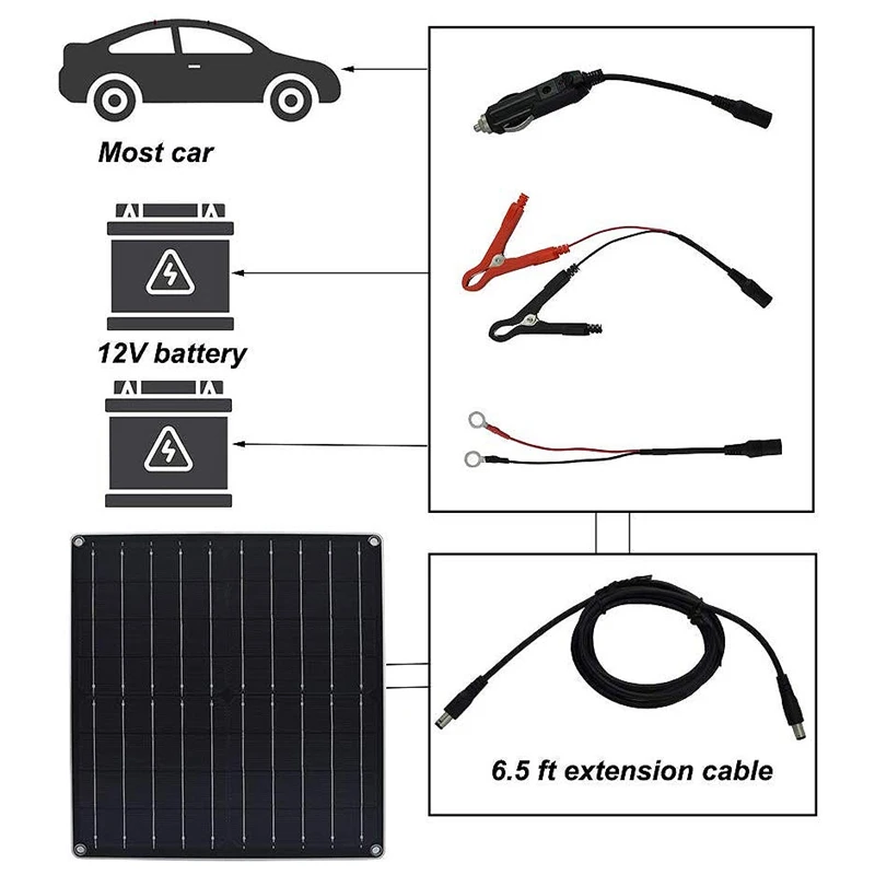 Монокристаллическая солнечная панель 12 вольт постоянного тока солнечное зарядное устройство, идеально подходит для поддержания батареи автомобиля RV Мотоцикл лодка морской прицеп трактор квадроциклы грузовики и т. Д. Он предназначен для поддержания 12В батареи при надлежащем напряжении хранения с солнечным светом.