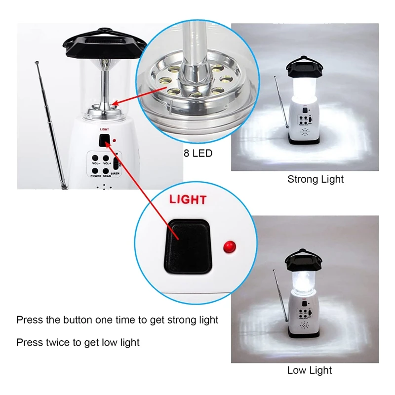 Плавно комбинированный светодиодный фонарь, fm-радио, мобильный телефон зарядное устройство, комбинированные, походные огни не только идеально подходят для активного отдыха, например, кемпинга, пеших прогулок, альпинизма и так далее, но также бесценный и незаменимый инструмент для ваших срочных потребностей благодаря революционному дизайну и производству нескольких вариантов питания.