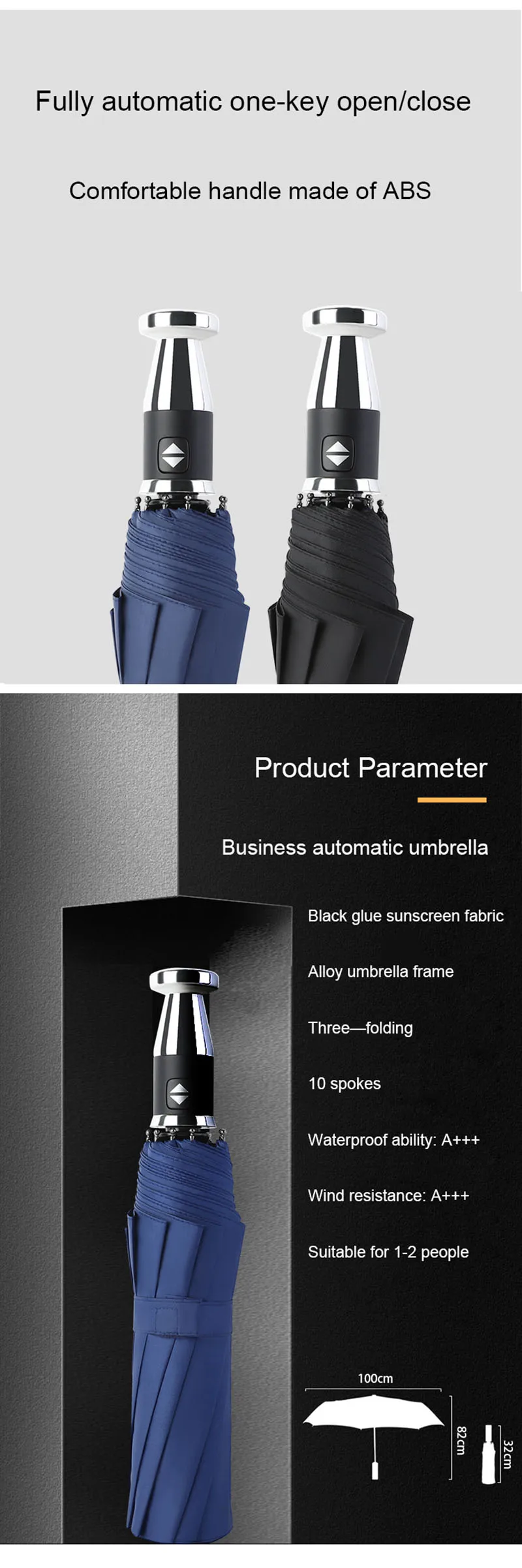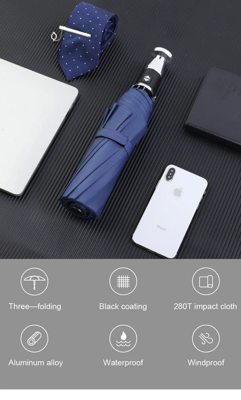 Параметры продукта: Полностью Автоматическая бизнес зонтик Материал зонта: ударная ткань Плотность ткани зонта: 280T Клей для зонта: черный клей Материал зонта: волокно Удочка средняя Материал: сталь Количество спиц: 10 спиц Водонепроницаемость: A + + + Сопротивление ветра: A + + + Вес: 600 г Длина после складывания: 32 см Подходит для 1-2 человек