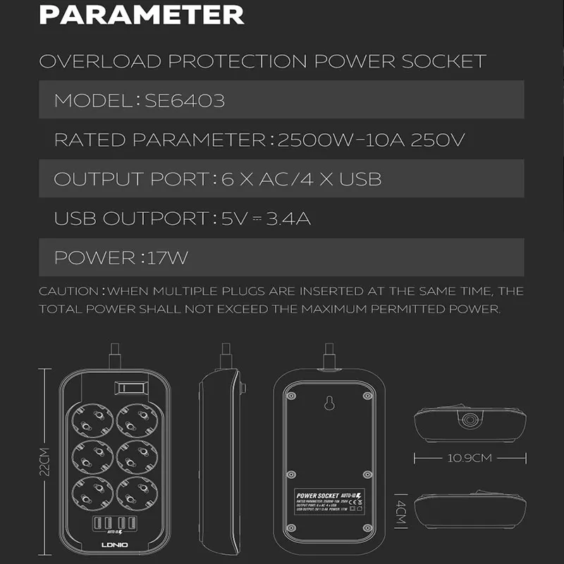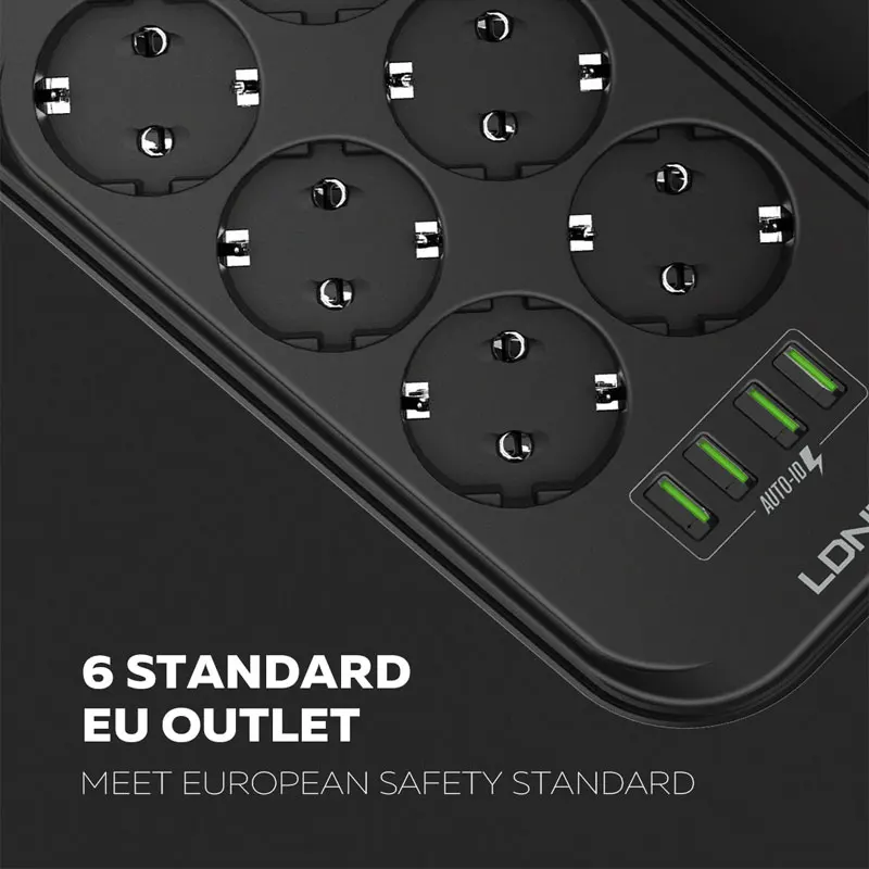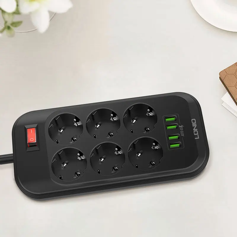 Особенности: * Сделано в интересном современном дизайне. Это устройство станет отличным дополнением к интерьеру, как дома, так и в офисе. * Фильтр не занимает много места и имеет компактный размер. 6 розеток и 4 usb-порта, расположенных на одном устройстве. * Разъемы равномерно распределены по корпусу-это делает Соединительные устройства фильтром удобным и безопасным. Можно свободно подключить громоздкие адаптеры переменного тока. * 4 смарт-выхода USB обеспечивают быструю и безопасную зарядку подключенных гаджетов. Интеллектуальный чип автоматически обнаруживает устройство и выбирает соответствующую зарядку питания. * Имеет встроенную защиту от перегрузки, перенапряжения, короткого замыкания, перегрева. * Отверстия являются слепыми, что защитит ваше устройство от пыли и влаги, а также несанкционированного случайного доступа. Это особенно важно, если у вас маленькие дети. * Прост в использовании. С помощью одной кнопки питания можно включить или отключить все подключенные гаджеты или устройства фильтра. * SE6403 изготовлен из высококачественных материалов. Для большей долговечности, а также контактов передачи тока изготовлены из меди. Шнур на основании фильтра защищен от сколов и трещин. * Шнур питания 160 см. * Устойчивость устройства снизу есть анти-скольжение. Они не только предотвращают скольжение сетевого фильтра и защищают поверхность, которая устанавливает устройство. Устройство изготовлено из прочного пластика, но имеет довольно скромные размеры. USB фильтр SE6403 подходит для подключения ваших гаджетов с током до 3,4 А наша компания несколько лет незад появился на рынке, но обратила на себя внимание. Необычный дизайн, качество сборки очень отличается среди массовых потребительских товаров. Под брендом выпущены зарядные устройства и соответствующие аксессуары разветвители гнезда. Используется смарт-технология Auto ID. Само устройство определяет тип подключенного устройства, его значение, значение. Анализируя его, будет автоматически определяться режим зарядки и оптимальное напряжение. Продукция этой компании находится на нашем сайте. Высокое качество сборки и материалов каждый сплиттер гнездо зарядное устройство LDNIO собраны из качественных компонентов очень точно. Производитель использует материалы, которые обеспечивают безопасную и длительную работу. Например, чехол изготовлен из огнеупорного пластика (до 750 градусов). Первая заявлена высокая степень защиты от скачков напряжения, короткого замыкания, перегрева. Необычный дизайн линейки LDNIO отличается от того же инструмента нестандартного дизайна. Вставьте металл, различные цветовые комбинации, функциональный дисплей и подсветку. Это удобные и красивые гаджеты премиум-класса.