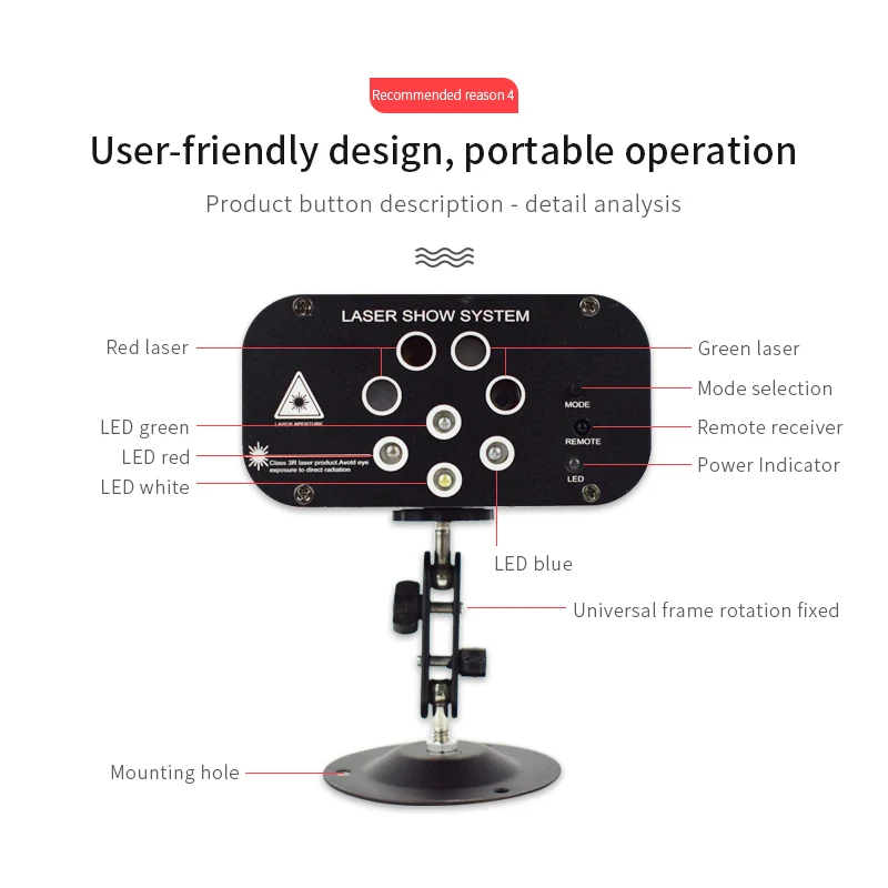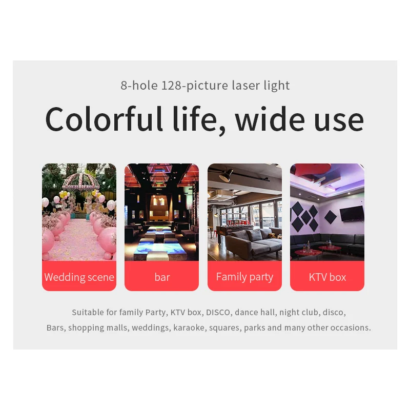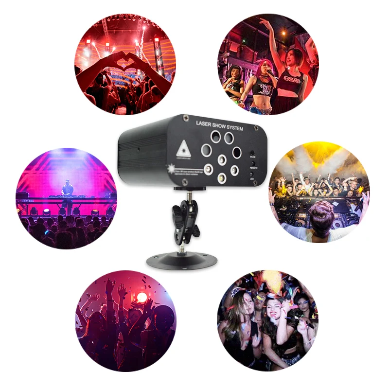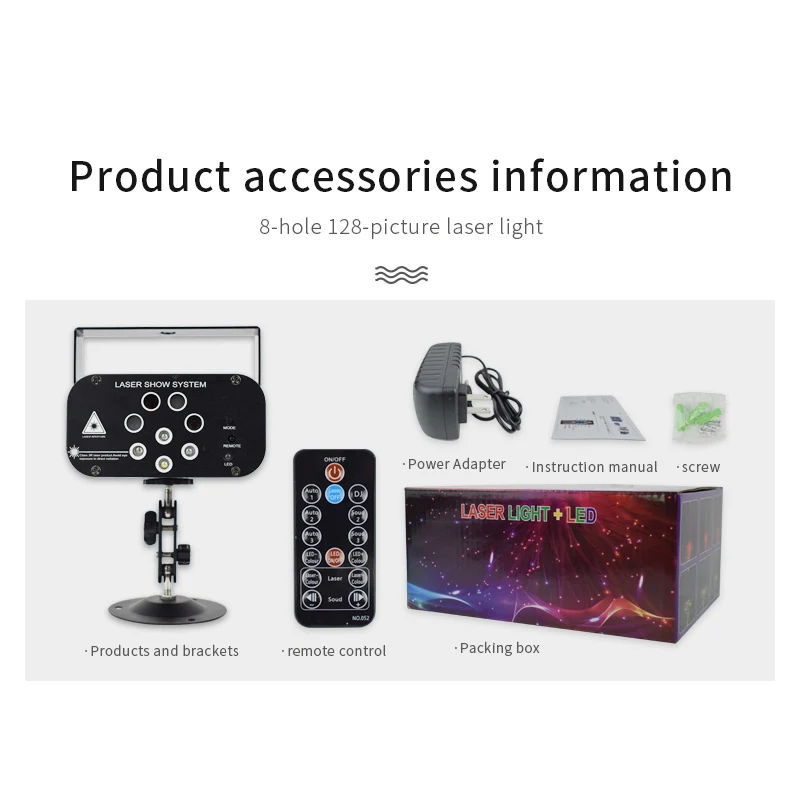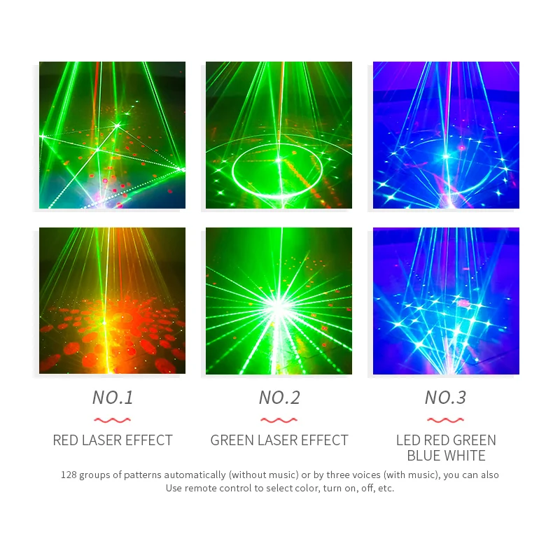 Название продукта]: 8 отверстий 128 моделей лазерных ламп 1. Источник питания: AC100V-240V, 50 Гц-60 Гц 2. Адаптер питания: DC12V / 1.5A 3. Потребляемая мощность: 15 Вт 4. Источник лазера: Зеленый светильник 50 мВт (регулируемая мощность), Красный светильник 100 мВт 5. Светодиодный светильник: красный, зеленый, синий, белый 6. Лазерный источник: Красный светильник * 2, зеленый светильник * 2 7. Длина волны лазера: 532 нм Зеленый светильник, 650нм красный светильник 8. Рабочая среда: 10-40 ℃ 9. Время предварительного нагрева: 2-8 минут 10. Режим управления: руководство, дистанционное управление 11. Режим работы: Самостоятельная ходьба, Голосовое управление