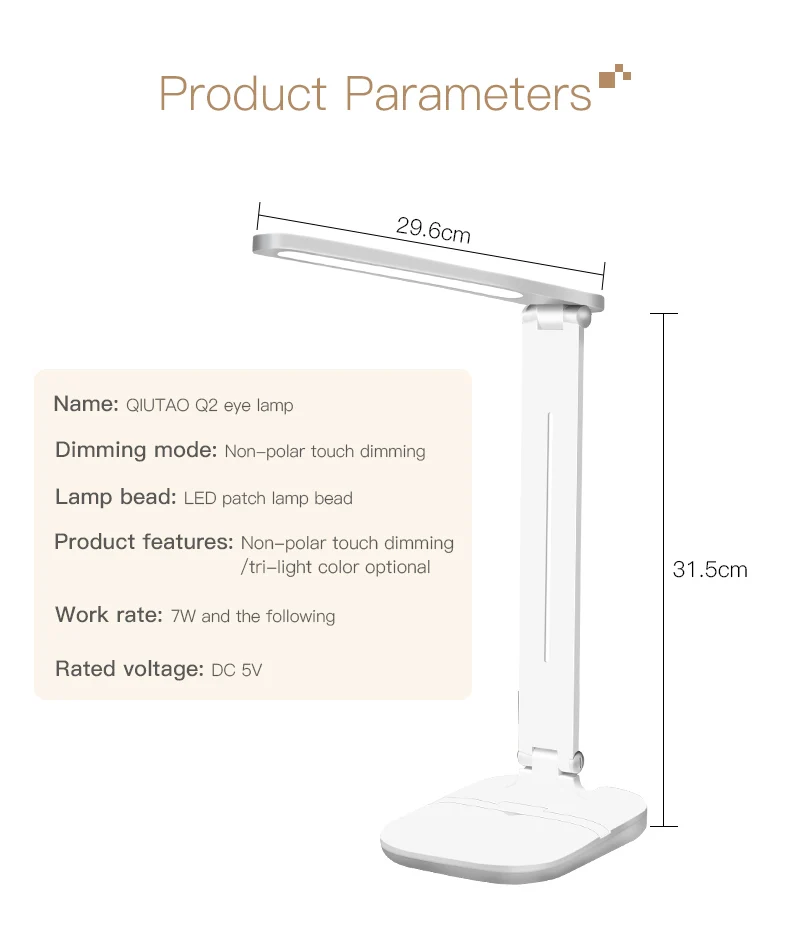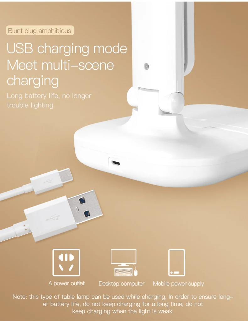 Наименование товара: светодиодный Настольный светильник Материалы: абс + светодиодный Мощность: 7 Вт Входное напряжение: 5 В постоянного тока USB Перезаряжаемый Литий-ионный аккумулятор Емкость: 2000 мАч Выход зарядного устройства: 5 В/1 А USB кабель: 1,2 м Складной