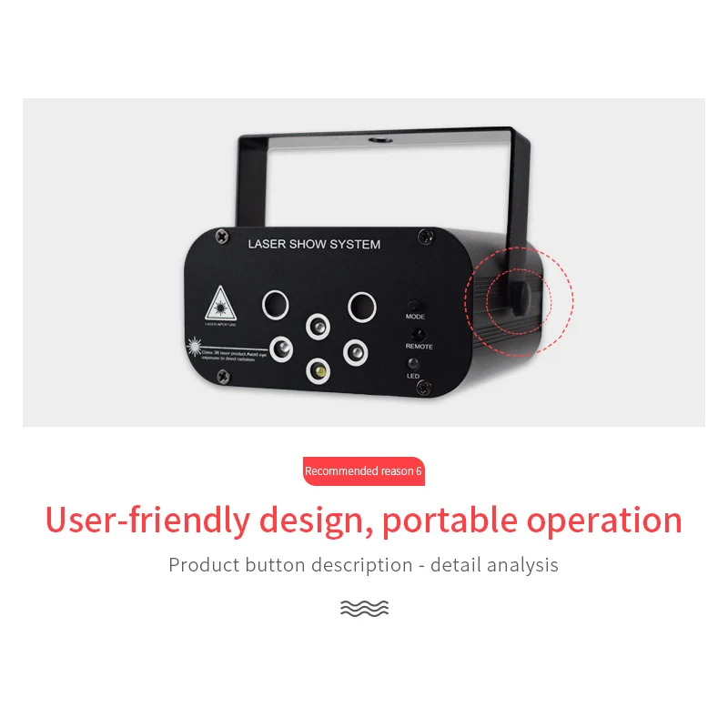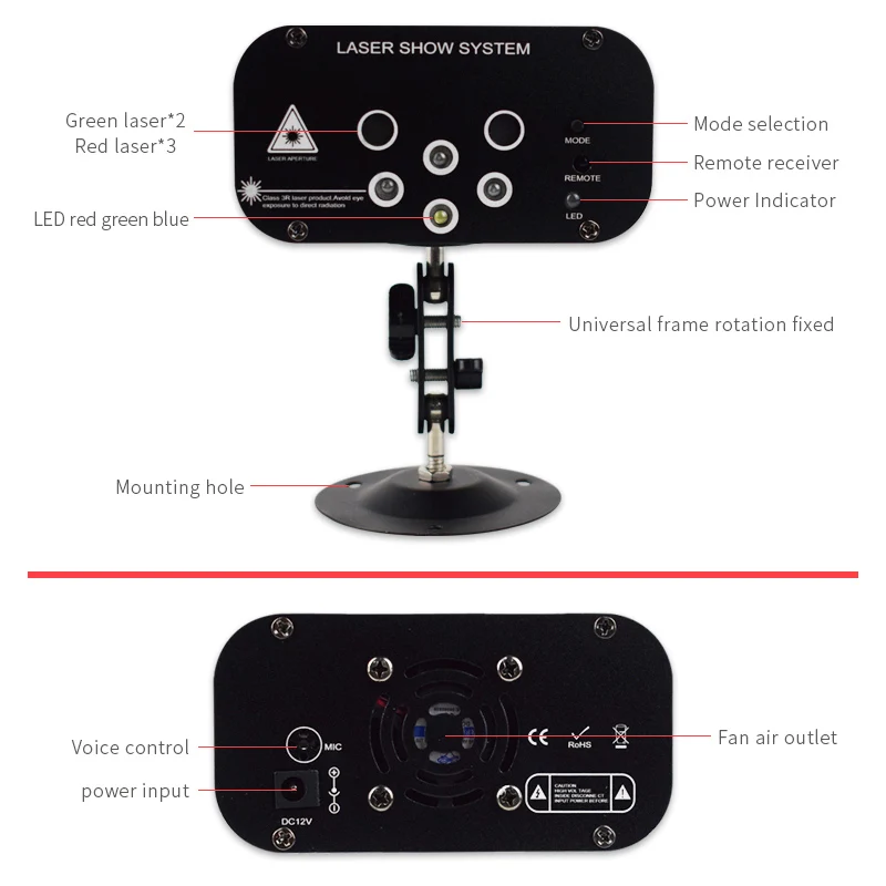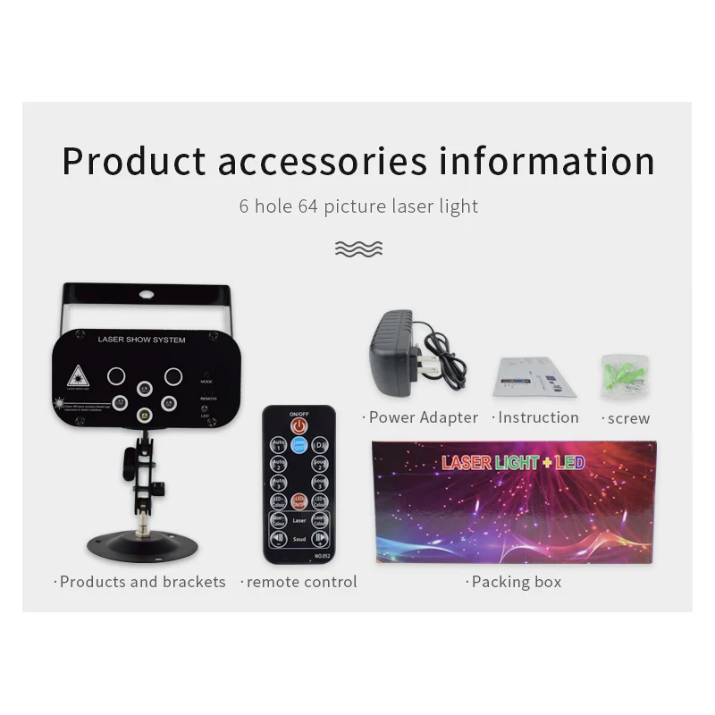 Название продукта]: 6 отверстий 64 узоров лазерных ламп 1. Источник питания: AC100V-240V, 50 Гц-60 Гц 2. Адаптер питания: DC12V / 1.5A 3. Потребляемая мощность: 15 Вт 4. Источник лазера: Зеленый светильник 50 мВт (регулируемая мощность), Красный светильник 100 мВт 5. Светодиодный светильник: красный, зеленый, синий, белый 6. Лазерный источник: Красный светильник * 1, зеленый светильник * 1 7. Длина волны лазера: 532 нм Зеленый светильник, 650нм красный светильник 8. Рабочая среда: 10-40 ℃ 9. Время предварительного нагрева: 2-8 минут 10. Режим управления: руководство, дистанционное управление 11. Режим работы: Самостоятельная ходьба, Голосовое управление