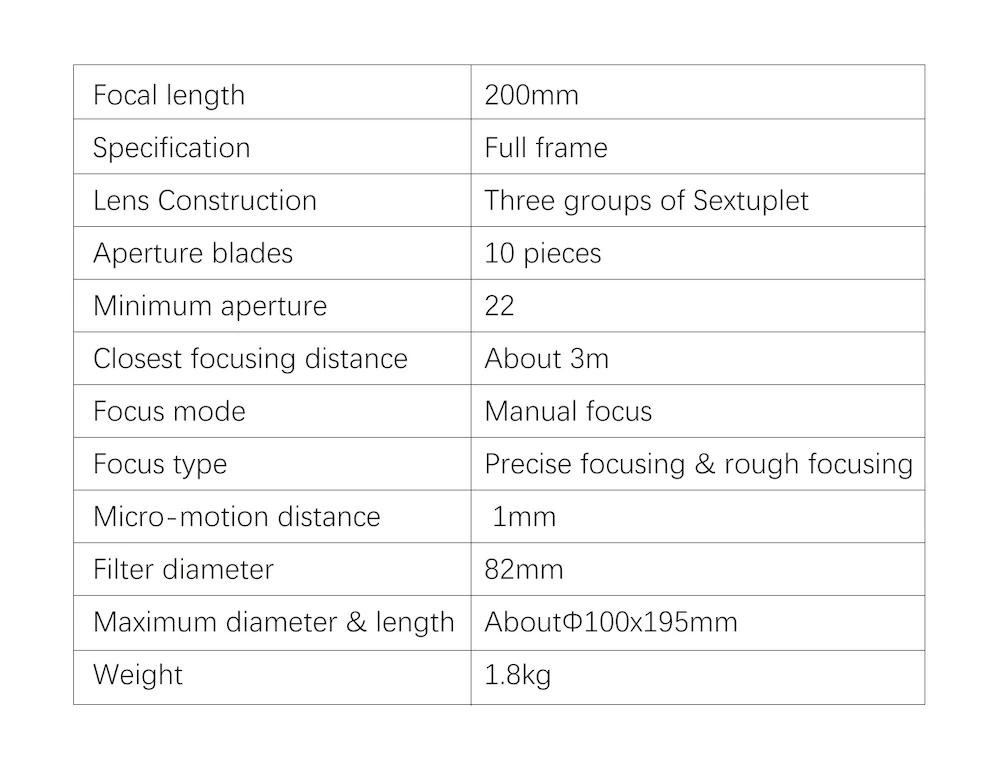 Профессиональный астрофотографический объектив world-first 200 мм разработан с таким же внешним видом, как и обычный объектив камеры, который имеет интегрированную структуру. Компактный, легкий и простой в использовании.