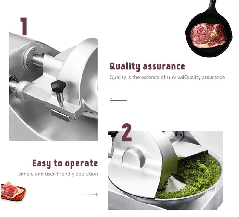 1. Можно нарезать и нарезать свежее мясо и овощи на кусочки мгновенно и сохранить его питание и вкус. 2. Корпус из алюминиевого сплава, обработка анодированной поверхности, защита от ржавчины и коррозии 3. Высококачественное лезвие из нержавеющей стали и пищевая чаша прочные и долговечные. Соответствует международным санитарным стандартам 4. Пищевая тарелка легко снимается. Легко чистить и устанавливать 5."S" форма лезвия, высокая скорость, высокая эффективность, экономия труда и времени