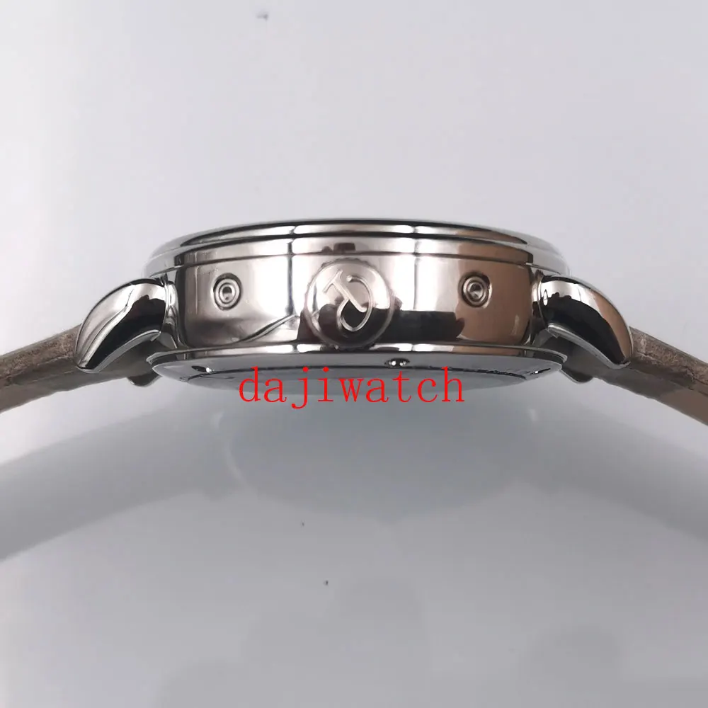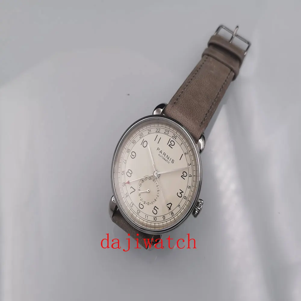 Мужские автоматические механические часы Parnis 42 мм GMT с серебристым корпусом и кожаным ремешком