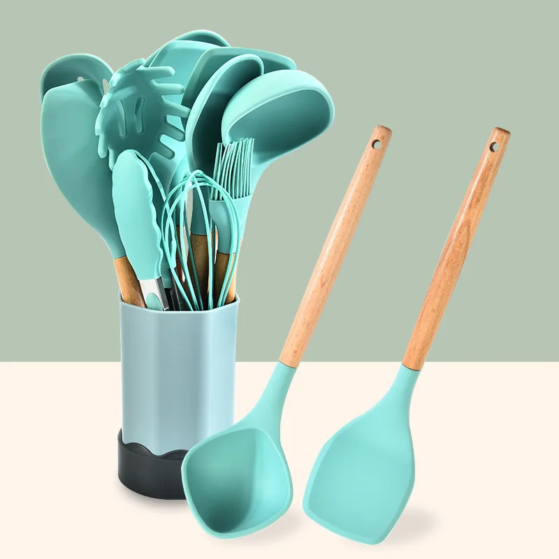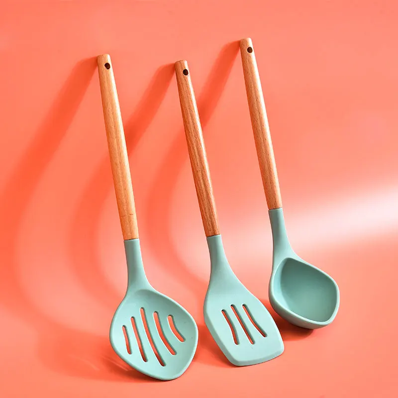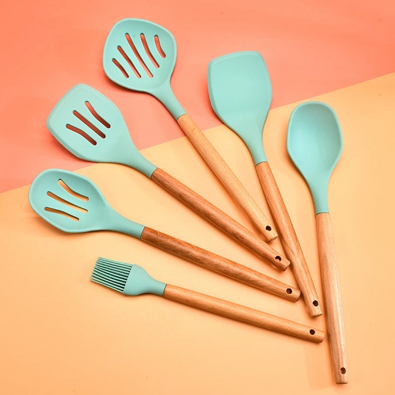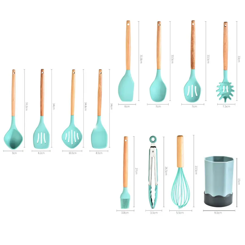 12 шт., натуральные деревянные ручки, инструмент для приготовления пищи, не содержит BPA, нетоксичные силиконовые щипцы для Тернера, лопаточка, ложка, гаджеты для кухни посуда, набор
