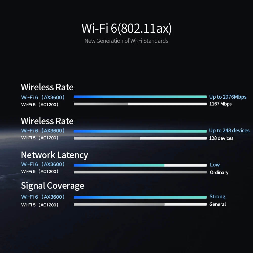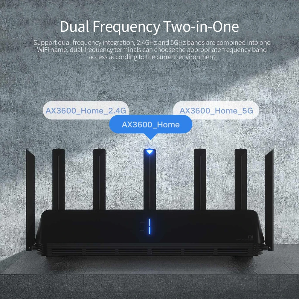 Маршрутизатор обеспечивает два диапазона частот 2,4 ГГц и 5 ГГц, как группы поддержки 802.11ax технологии и не мешать друг другу, двухдиапазонный, Wi-параллельные Беспроводная скорость до 2976 Мбит/с. 2,4 ГГц полосы передает посылаемый на более дальнее расстояние, имеет более широкий охват и стену. Полоса 5 ГГц имеет меньше помех и высокую скорость, более плавный, чтобы смотреть HD видео и играть в онлайн-игры.