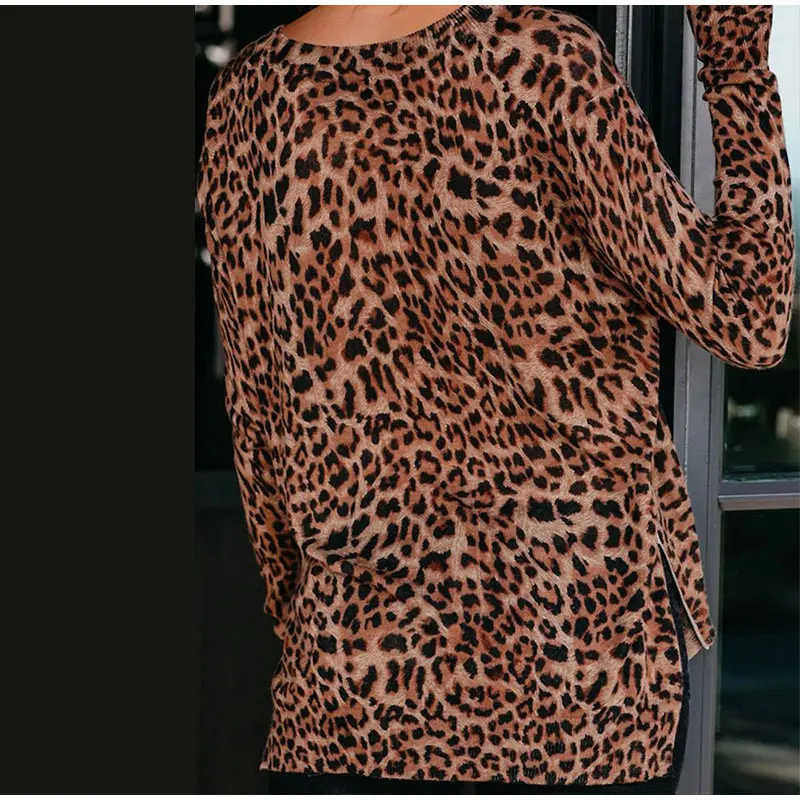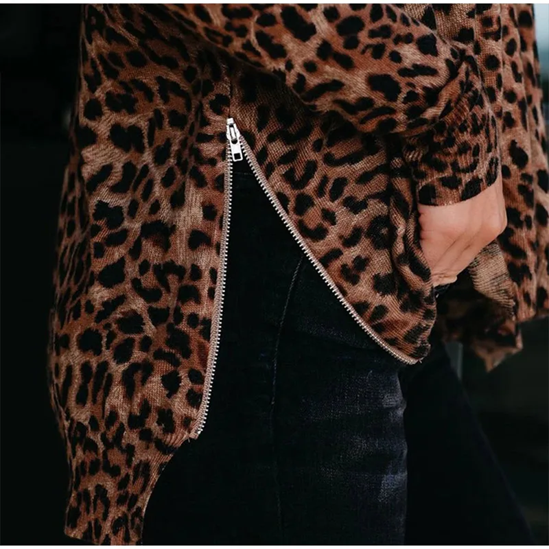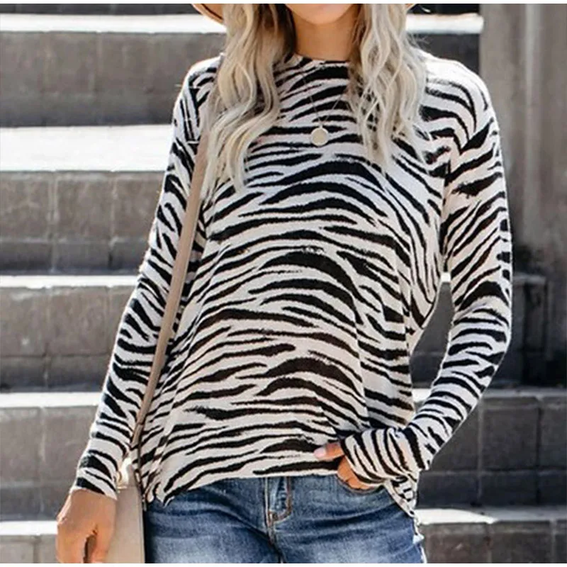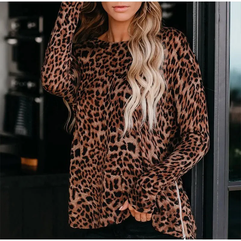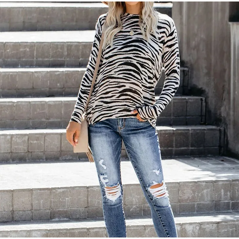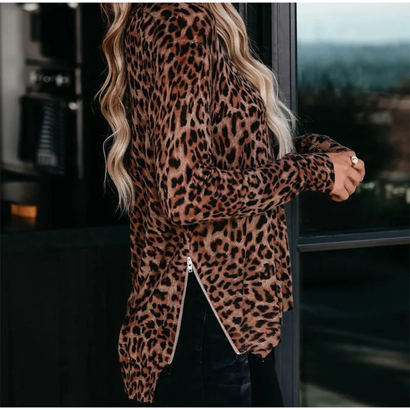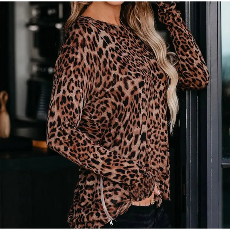 Осенняя женская футболка в полоску размера плюс с леопардовым принтом и круглым вырезом, женские футболки на молнии с длинным рукавом, 2021 модные уличные женские топы