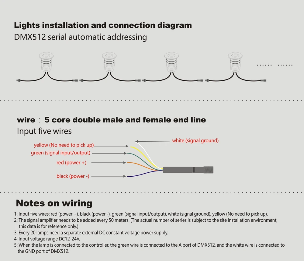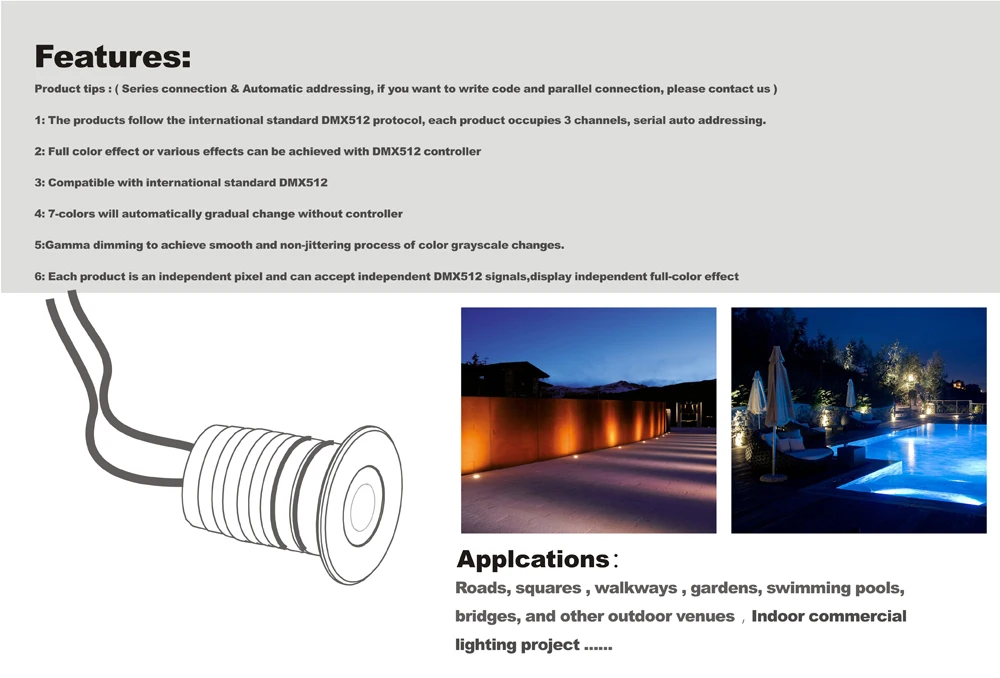 Примечания:1: Лампа соответствует международному стандарту DMX512 протокола, каждая лампа занимает 3 канала, автоматическое соединение серии.2: внешний контроллер DMX512 может реализовать полноцветный эффект или различные формы.3: Совместимость со стандартной консолью DMX512, совместно с другими DMX512.4: автоматический, в наличии 7 цветов, циклическая постепенно Меняющие цвет без какого-либо внешнего управления.5: гамма-Диммирование, для достижения гладкой и без дрожания в процессе изменения цветовой шкалы серого.6: каждая лампа является независимым пикселем, и каждая лампа может получать независимый сигнал DMX512 и отображать независимый полноцветный эффект.Посылка включает в себя: