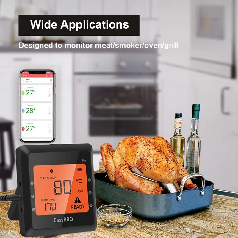 Устройство должно работать с приложением, которое будет установлено на вашем телефоне; До шести гнезд зонда, чтобы легко отслеживать более одной температуры пищи.
