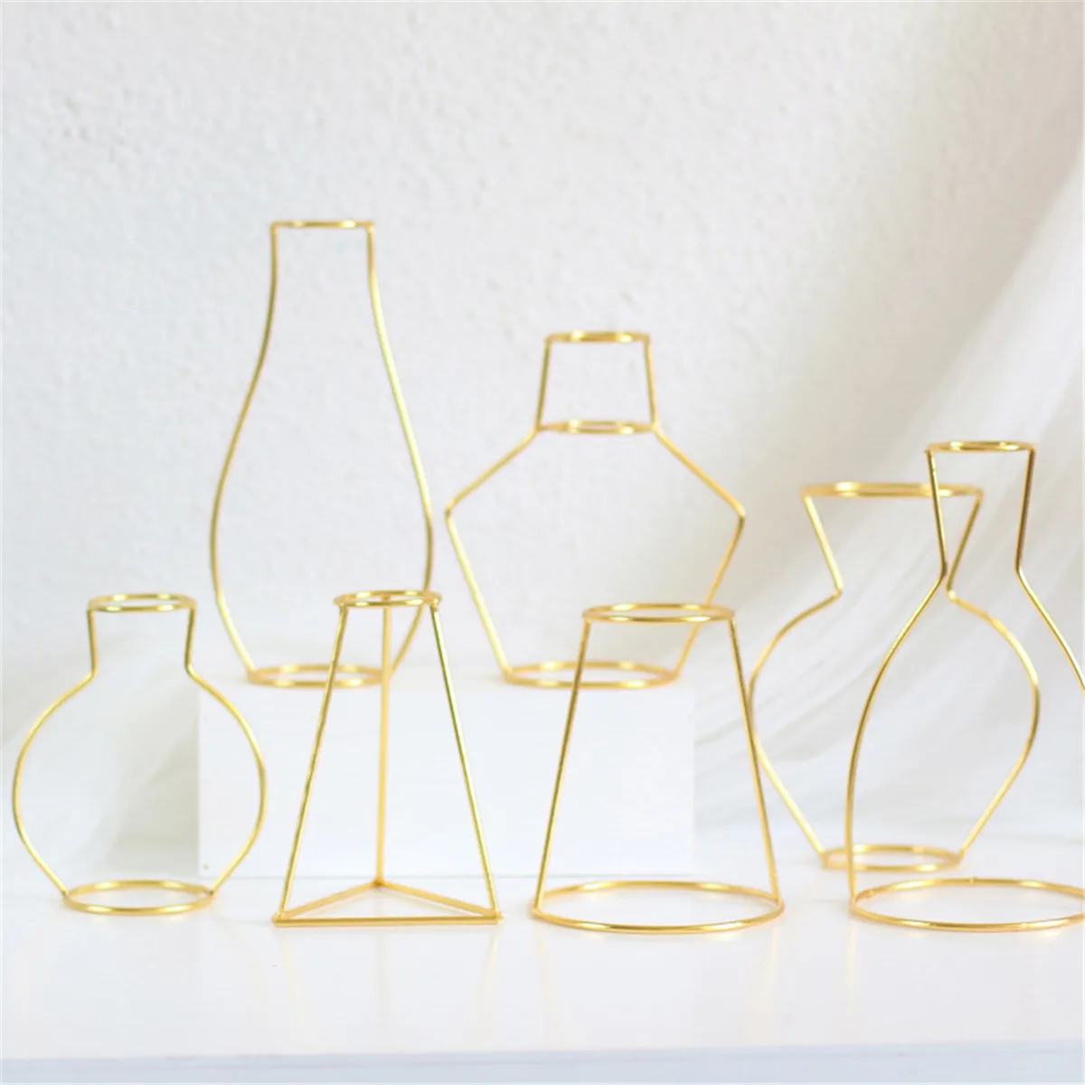 Скандинавские железные вазы с металлическим держателем для растений, золотые железные художественные вазы с проволочным цветком, геометрический декор, металлическая рамка, Современное украшение для дома