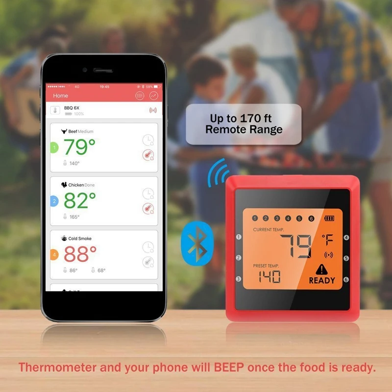 Вы прочитаете состояние пищи в режиме реального времени на вашем устройстве, даже если вы находитесь в 100 метрах от термометра; Он будет оповещать устройство и ваш телефон, когда еда будет готова.
