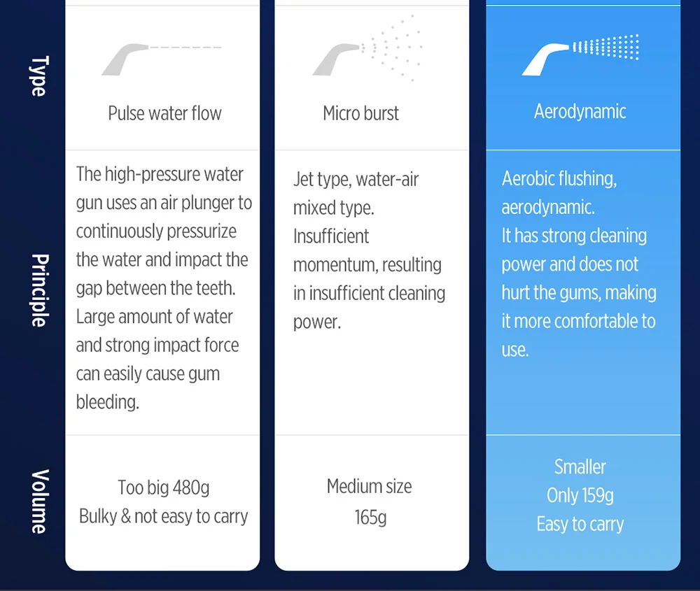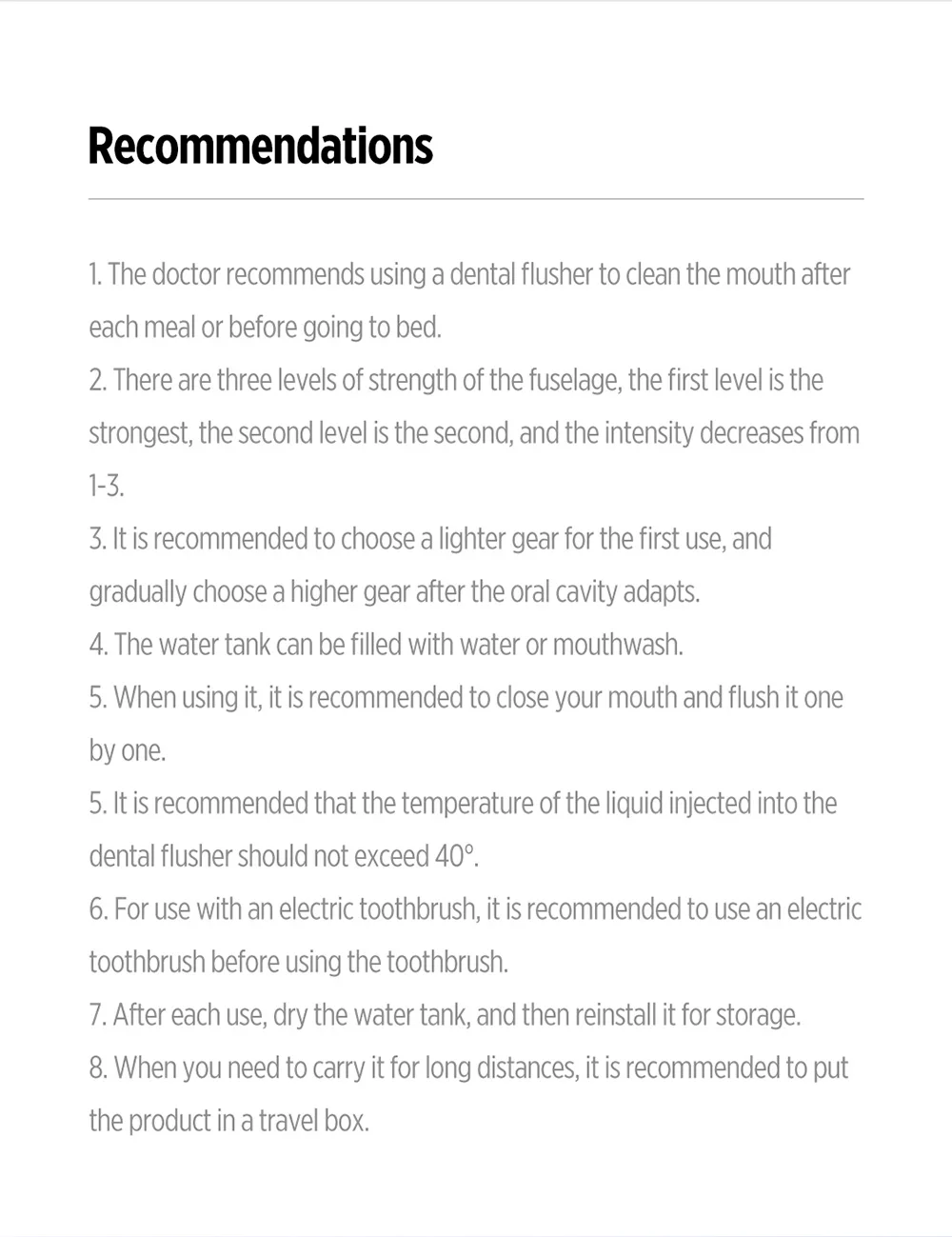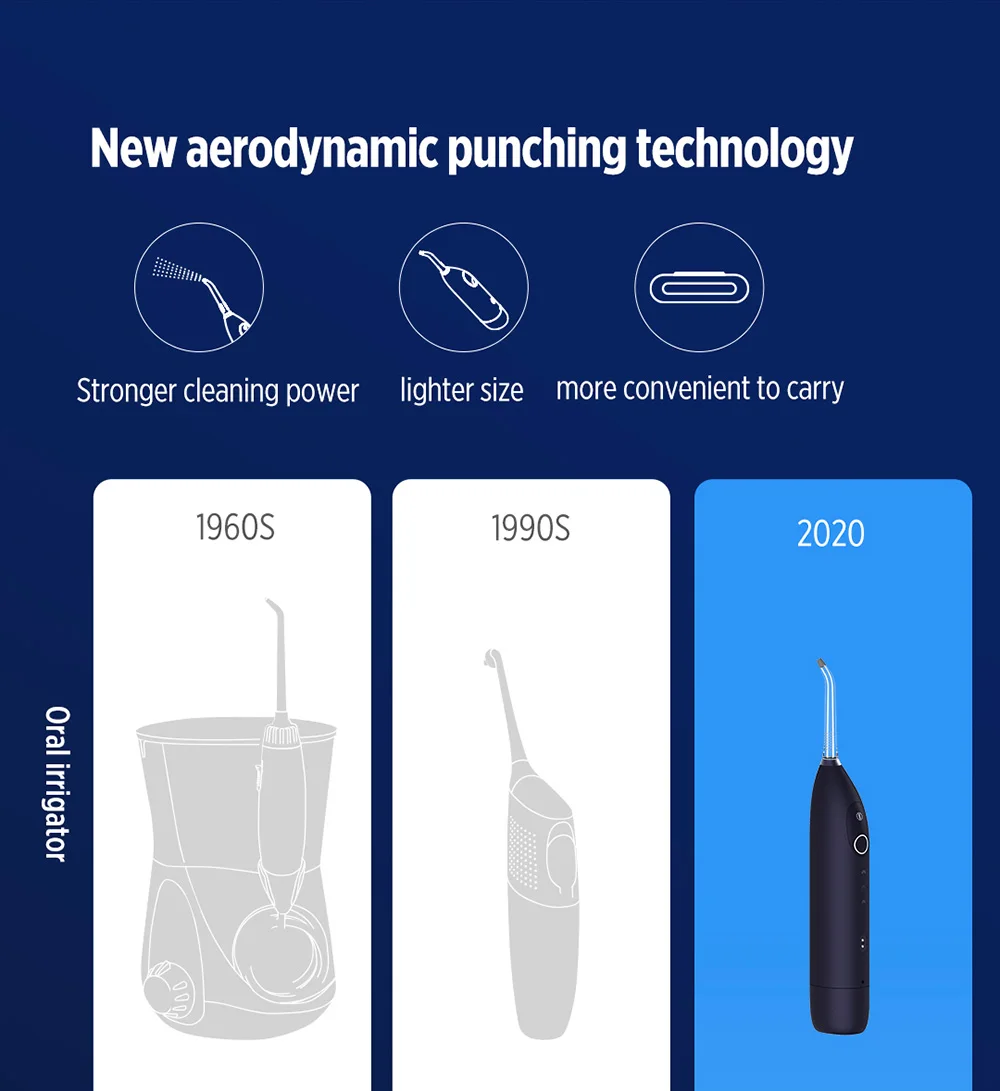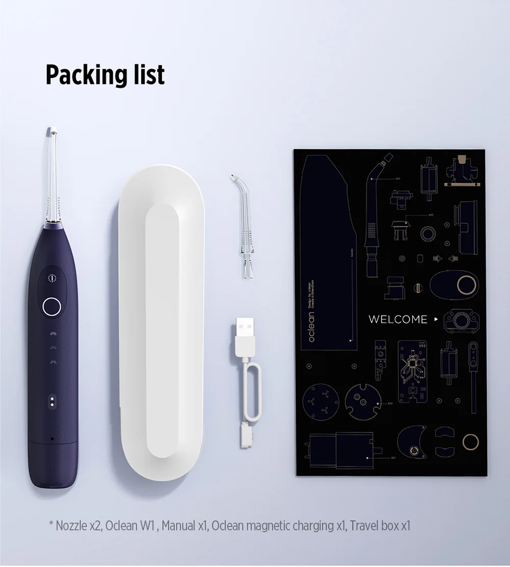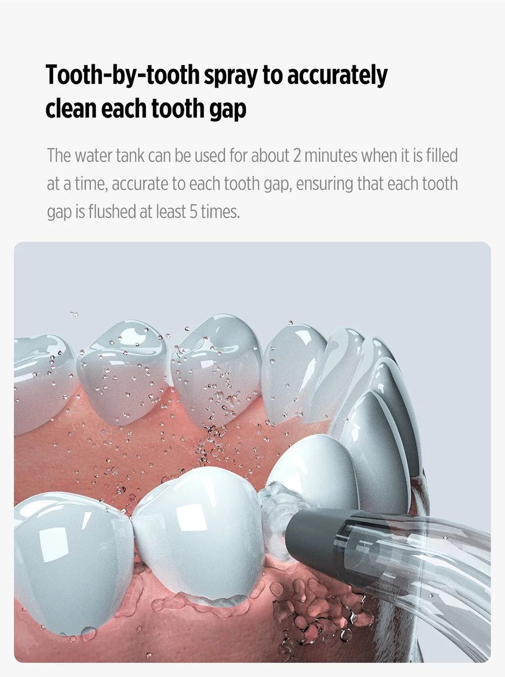 Основные Особенности: Маленький размер, ультра-портативный ирригатор полости рта Инновационное аэродинамическое устройство ирригатора полости рта; Более мощная очистка и более комфортный опыт промывки. Умный ирригатор для полости рта поддерживает сочетание режима зубной нити, мягкого режима, режима массажа десен и режима настройки приложения. Дорожный набор, легко взять. Метод смешивания воды и воздуха обеспечивает более надежную защиту десен, очистку и уменьшение повреждения пародонта. Смесь воды и воздуха Уменьшает рост анаэробных бактерий во время промывки зубов и освежает дыхание. Можно использовать для полоскания рта, чтобы стерилизовать и уменьшить воспаление и сделать дыхание более свежим. Приложение может устанавливать различные комбинации режимов очистки. Объем резервуара для воды 30 мл, который может впрыснуть 150 раз. Технические характеристики: Цилиндр Ёмкость: 3,0 мл Емкость резервуара для воды: 30 мл Режим очистки: стандартный, нежный, массажный Частота водяного насоса: около 3 раз/2 с (стандартный режим); Около 2 раз/с (мягкий режим) Bluetooth: BT4.2 и выше, поддержка Oclean APP Автоматическая схема очистки Tme: 15 дней (время работы рассчитывается на основе режима по умолчанию, 2 минуты каждый раз, 2 раза в день) Зарядка: USB порт/5V1A Время зарядки: 2 часа
