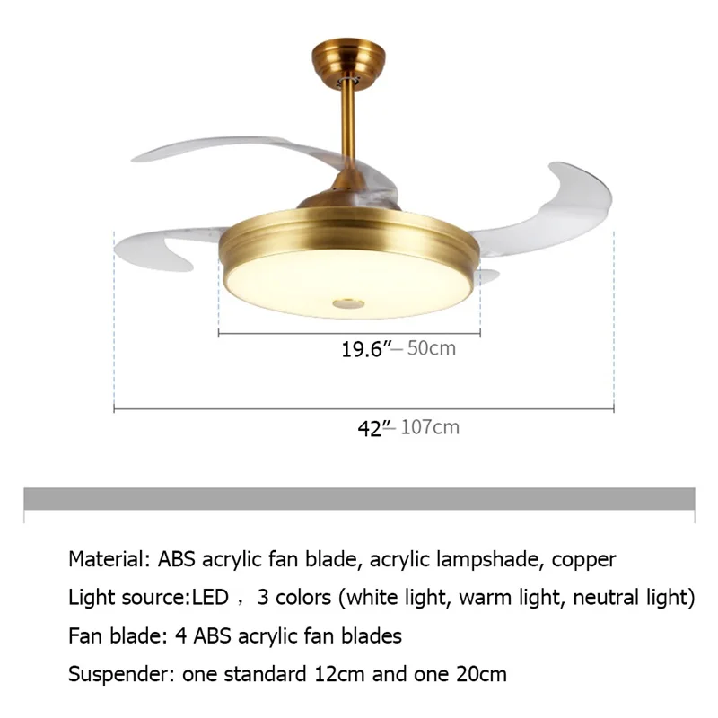 Часто задаваемые вопросы В1: Клиент: Что делать, если мы не получим товар в течение согласованного времени? Магазин: мы полностью вам компенсируем. В2: Клиент: Что мне делать? Если он поврежден во время транспортировки? Магазин: во-первых, эта вероятность очень низкая, и во-вторых, мы компенсируем Вам в полном объеме, если вы действительно столкнулись с повреждением во время транспортировки, пожалуйста, будьте уверены. Материал: лопасть вентилятора: ABS акрил, абажур: акрил, корпус лампы: медь Лопасть вентилятора: 4 лезвия ABS акриловый веер Напряжение: 220-240 В/110-120 в Источник освещения: светодиодный 3 цвета (белый светильник, теплый светильник, нейтральный светильник) Подтяжки: один стандартный 12 см и один 20 см Применимое пространство: гостиная, столовая, спальня, коридор