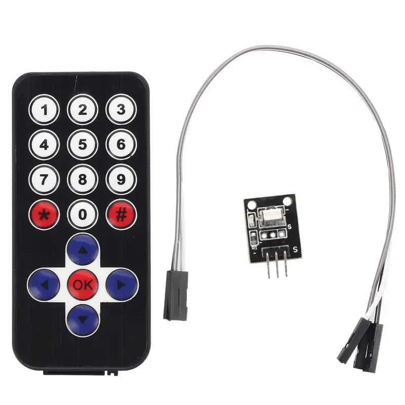 Инфракрасный ИК беспроводной пульт дистанционного управления для Arduino, включая кнопочную ячейку CR2025, если вы хотите управлять своим приложением Arduino с помощью пульта дистанционного управления, вы можете использовать этот набор, состоящий из небольшого инфракрасного пульта дистанционного управления (с перекрестным управлением, кнопки "OK", "0-9" * "и" # "), подключаемый модуль, Дополнительная отправка диодов и 3 подключаемых соединения (розетка на розетке) удобно Управляйте своим приложением, а также на расстоянии!