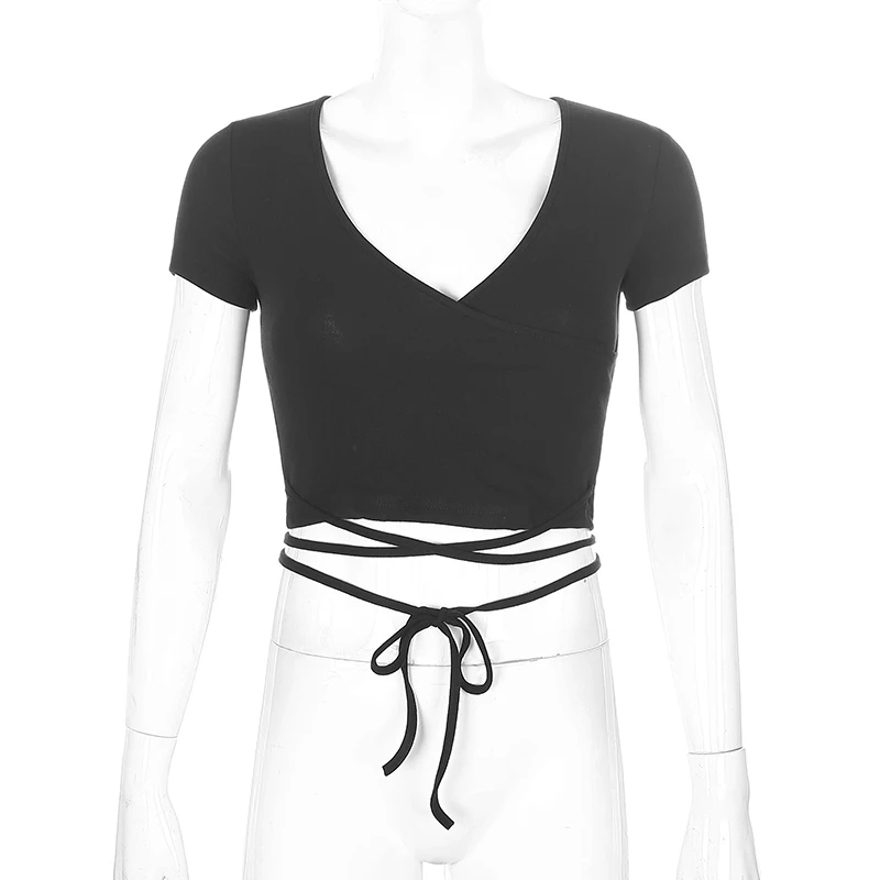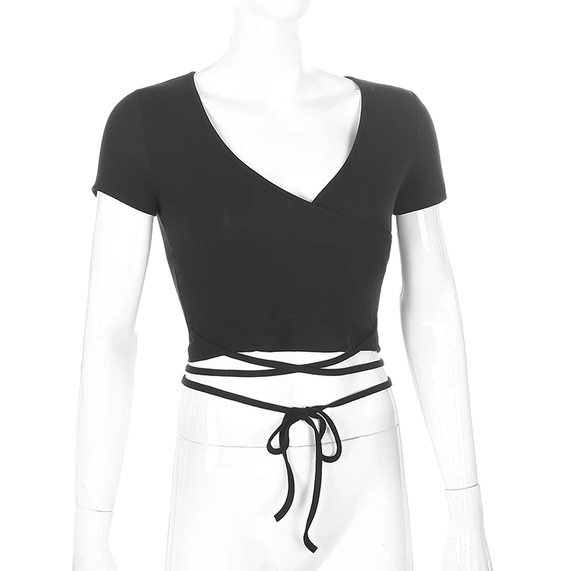 Женская футболка с коротким рукавом, летний модный сексуальный укороченный топ с v-образным вырезом и перекрестной шнуровкой, однотонный
