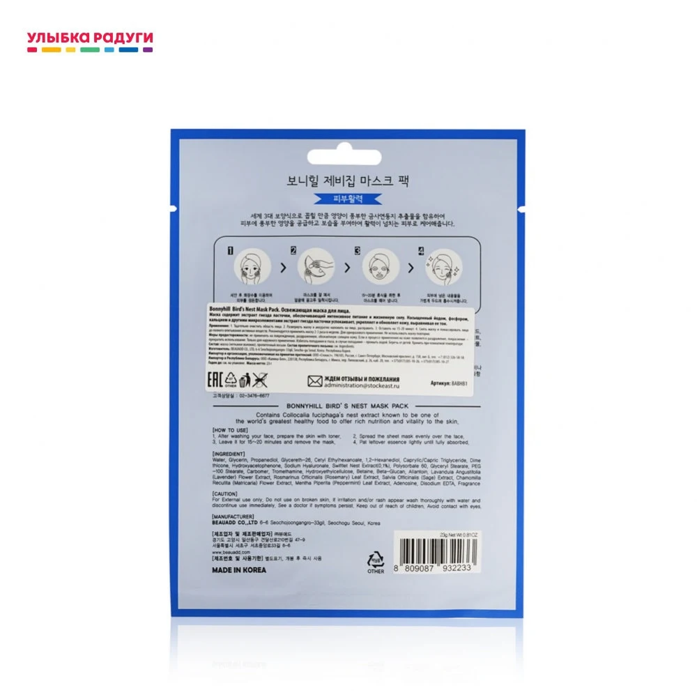 Применение: Тщательно очистить область лица, развернуть маску и аккуратно наложить на лицо, расправить. Оставить на 10-20 минут. Cнять маску и помассировать лицо до полного впитывания активных веществ.