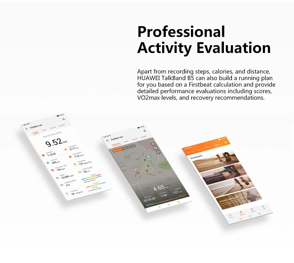 Помимо записи шагов, калорий и расстояния. HUAWEI TalkBand B5 также может разработать для вас план работы на основе первого расчета и предоставить подробные оценки производительности, включая оценку, уровни VO2max и рекомендации по восстановлению.