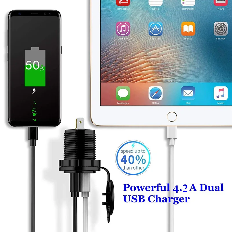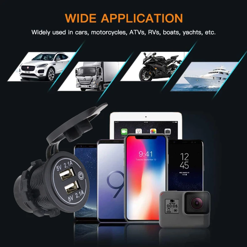 Характеристики:Входная мощность: DC 12V-24VВыходное напряжение USB: 5 ВВыходной ток: 4.2A ( 2.1A и 2.1A)Максимальная мощность: 21 Вт Особенности:* Двойное Зарядное устройство USB с выключателем* Светильник катор* Защита от брызг и пыли* Широкая совместимость* Высокий стандарт безопасности Посылка входит:1x зарядное устройство USB с двумя портами2x Синий терминал(1 провод 60 см с предохранителем 10 А)