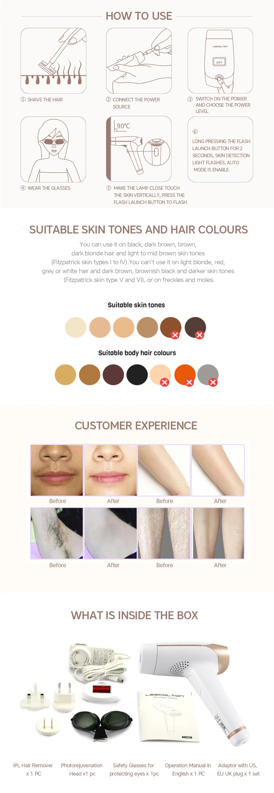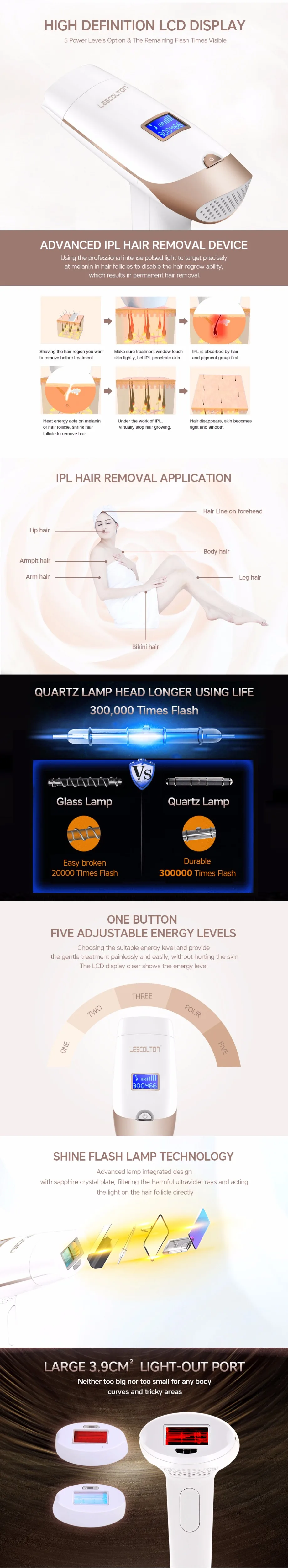 Применение: Рабочее напряжение 100 ~ 240 В, подходит для всех стран мира. Стойкость: IPL действует в порах, разрушая дермальный фолликул, тем самым обеспечивая постоянное удаление волос. Длительный срок службы: кварцевую лампу можно депилировать, с более длительным сроком службы и долговечностью, без нуля Расходные материалы, без носителей, без расходных материалов. Безболезненно: в соответствии с погрешностью на кожу, пять регулируемых оптимальных уровней энергии. Обеспечивает нежный уход без боли и усилий, не повреждая кожу. Светильник четко показывает уровень энергии. Быстрая обработка и большая площадь точек: 4,2 квадратных сантиметров не слишком большой или слишком маленький для любого изгиба тела, благодаря эффективной и быстрой скорости удаление перекрывающихся участков волос за несколько минут, это сложно добиться традиционных методов удаления волос. Безопасность: не влияет на нормальное потоотделение и секрецию потожировых желез. Удобство: Портативный дизайн, удобно носить с собой Способность обнаружения кожи: при готовности к работе ЖК-дисплей загорается.