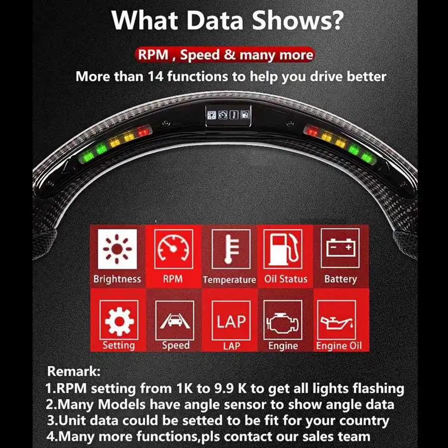 1. Светодиодный индикатор сдвига включает в себя 5 комплектов светодиодный s на каждой стороне рулевого колеса, который постепенно загорается зеленым цветом по мере увеличения оборотов двигателя. Как только он достигнет настроенного пользователем RPM, индикатор мигает красным как напоминание о сдвиге вверх. Светодиодный индикатор переключения передач, регулируемый от 500 об/мин до 9900 об/мин, светодиодный светильник переключения цветов, регулируемый для цвета RGB.