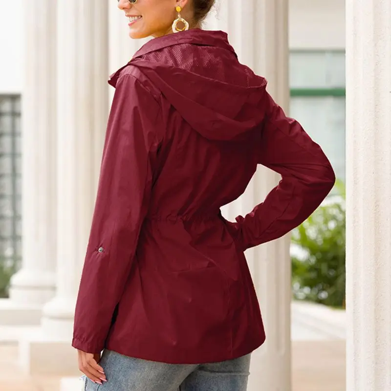 Быстрое высыхание и водостойкость. Вы можете подтянуть его, чтобы показать свою фигуру, положить капюшон вверх, чтобы оставаться в тепле.