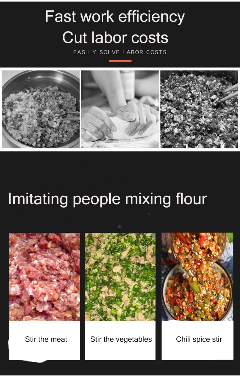 Равномерно размешать, прочность теста высокая, легко решить все виды пищи Этот продукт подходит для ресторанов, школьных ресторанов, предприятий и небольших предприятий по переработке пищевых продуктов. Он специально используется для теста, пара, закусок и т. д.