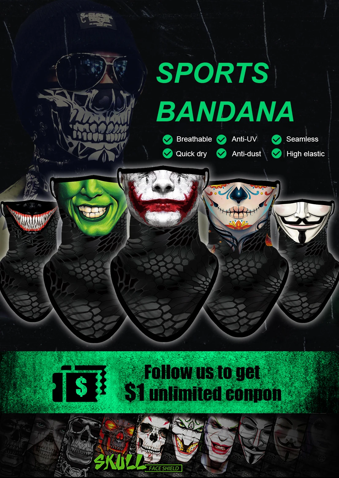 100% полиэстер микрофибра и UV50 + "солнцезащитный крем" для защиты от 99% УФ-лучей: растяжимое волокно, Высококачественная мягкая и удобная маска, не дешевый материал, который легко таблетки или порвать; он тонкий и легкий, но теплый и дышащий, не чувствуя дымки; Защищает ваше лицо от солнца, ветра, пыли, песка Нескользящая: эластичное растягивающееся волокно сохраняет маску на месте и не скользит Яркий 3D головной убор: изысканный 3D дизайн, Реалистичная печать, модный дизайн (напоминаем, 1. Край бесшовный и скатывается естественным образом; 2. Если вам не нравятся Глаза Черепа внизу, вы можете просто сложить их так же, как и основное изображение) Мульти-шарф: маска в виде черепа для мужчин и женщин и девочек; Молодежные: использование в качестве повязки на голову, шарфа, полумаски для лица, щитка для лица, запястья, повязки на голову, шейный платок, Балаклава и капот; Многократное использование: бег, охота, рыбалка, туризм, мотоцикл, катание на лыжах, сноуборде и снегоходах, езда на гору, велосипеде; Идеально подходит для байкеров, туристов, спорта, фестиваля