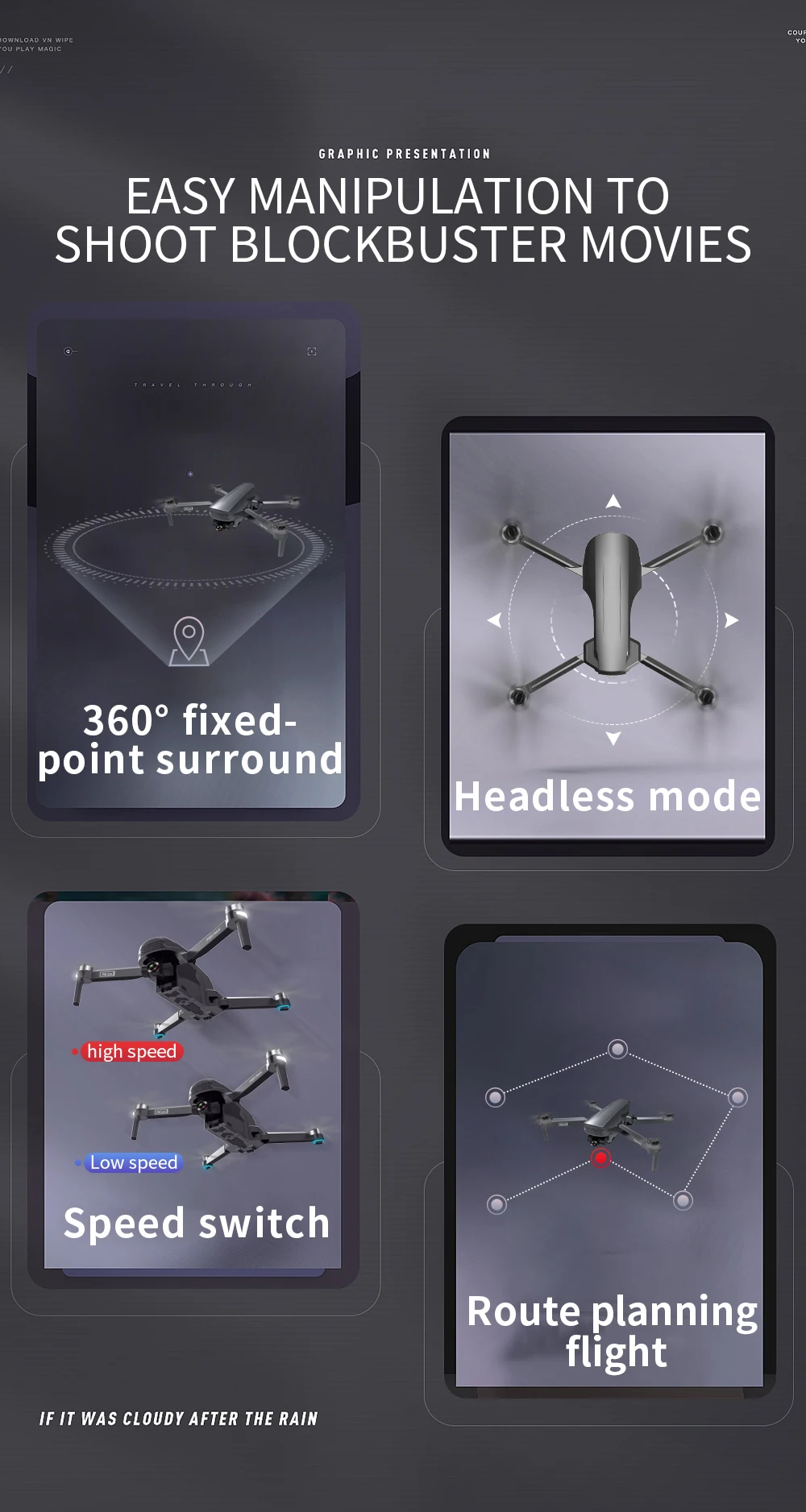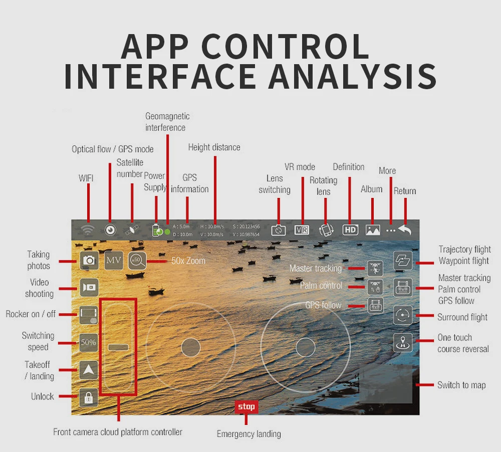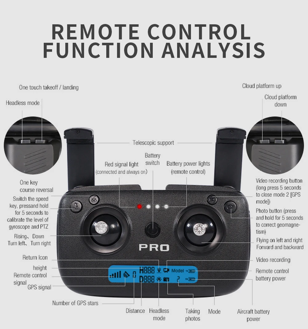 Датчик давления: установка высоты Двигатель: бесщеточный двигатель 1806 Мощность двигателя: 1700 кВ Регулировка электрической мощности: 30А Метод приема передачи изображения: 5G WIFI Подвес: трехосная механическая самостабилизирующаяся головка Объектив: самостабилизирующийся электронный объектив с защитой от сотрясения Максимальный размер зажима для телефона с дистанционным управлением: 5,5 дюйма Батарея пульта дистанционного управления: батарея AA 1,5 В * 4 (не входит в комплект) Емкость интеллектуальной литиевой батареи: 7,6 В, 3400 мАч Расстояние управления (свободное вмешательство и отсутствие окклюзии): 1200 м Время полета: около 26 мин. Время зарядки: около 6 часов Зарядка через USB: 5 В Размер продукта: развернуть 32x40x8см, сложить 18x9x8см Вес продукта : 534 г Pixel : Камера 4K HD Название приложения : HFun PIus (IOS Android) Угол подвеса (диапазон регулировки угла) Автоматическое восстановление 110 ° (по вертикали) 65 ° автоматическое восстановление (вбок) Автоматическое восстановление под 45 ° (по горизонтали) Объектив камеры : Регулируемая камера передатчиком, 110 ° Расстояние передачи изображения Wi-Fi (свободное вмешательство и отсутствие окклюзии): около 800 м GPS: следуй за мной: 30 м ИЗОБРАЖЕНИЕ Следуй за мной: 1-5 мин. Фокусное расстояние: 50X Съемка жестов руками / повторная съемка видео: 1-5 млн Разрешение видео (фронтальная камера) 2048 * 1080 (TF) Режим SD : 1208 * 720 (приложение) Режим HD : 2048 * 1080 (приложение) Разрешение фото (фронтальная камера) 4096 * 3072P (TF) 4096 * 3072P (приложение) Разрешение видео (камера вниз): 1280 * 720 пикселей Разрешение фото (камера вниз): 1280 * 720 пикселей Частота кадров: 25 кадров в секунду