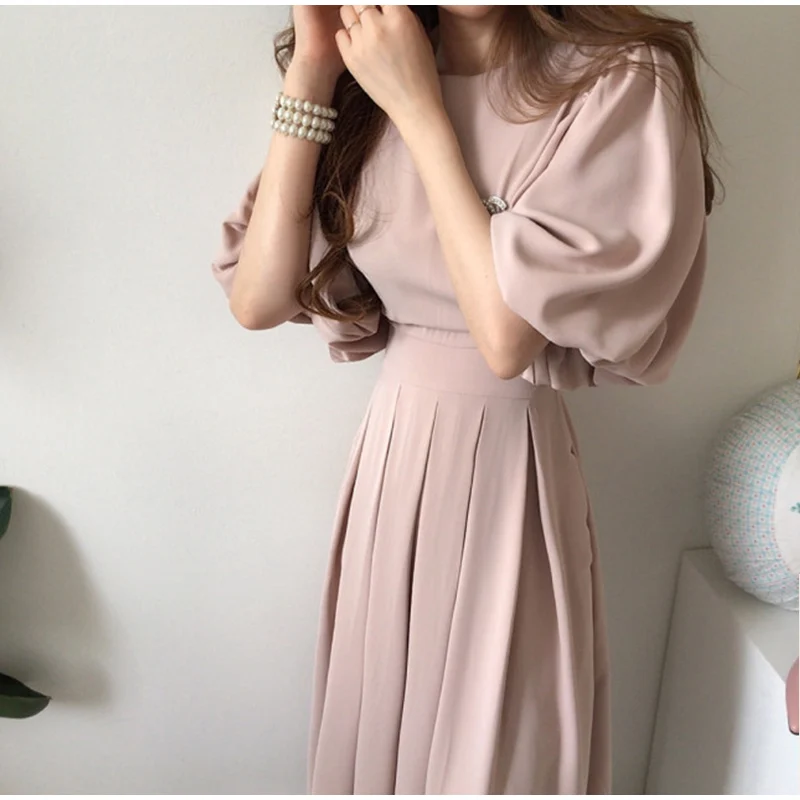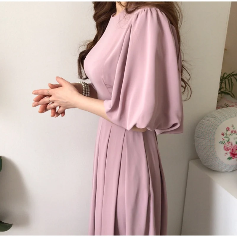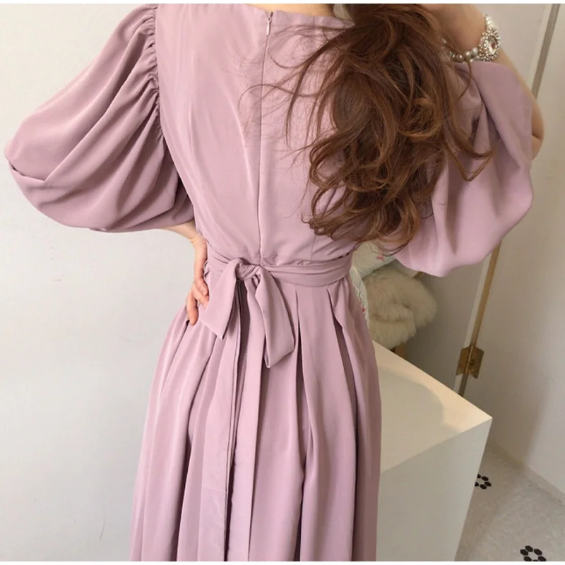 Осеннее Плиссированное женское длинное платье в стиле ампир с завязками и круглым вырезом, женские платья с рукавом-фонариком, новинка 2021, милая женская одежда
