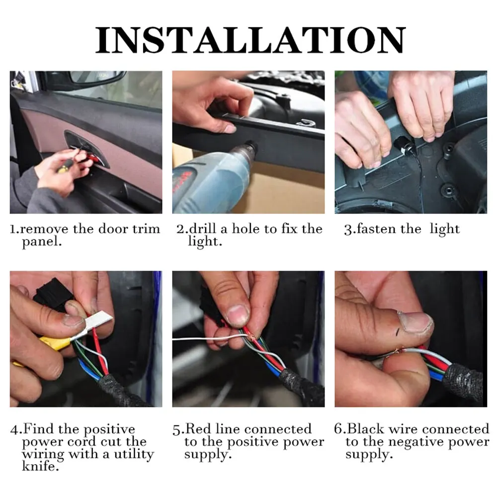 Особенности: -100% новый бренд. -Светодиодный Тип: светодиодный чип. -Материал: АБС + алюминиевый сплав. -Сертификация внешнего тестирования: CE. -Срок службы: более 90000 часов. -Номинальное напряжение: DC 9V-DC 14В. -Рабочая температура:-40 ℃ - 105 ℃. -Потребляемая мощность: 5 Вт (Каждая СВЕТОДИОДНАЯ лампа). Как установить? 1. Снимите отделочную панель двери. 2. Просверлите отверстие, чтобы зафиксировать светильник. 3. Закрепите светильник. 4. Подключите положительный и отрицательный провод. 5. Переустановите дверную отделочную панель. 6. Полная установка. Посылка: 1 сверла с отверстием. 2x двери автомобиля светодиодный лазерный проектор Тени светильник.