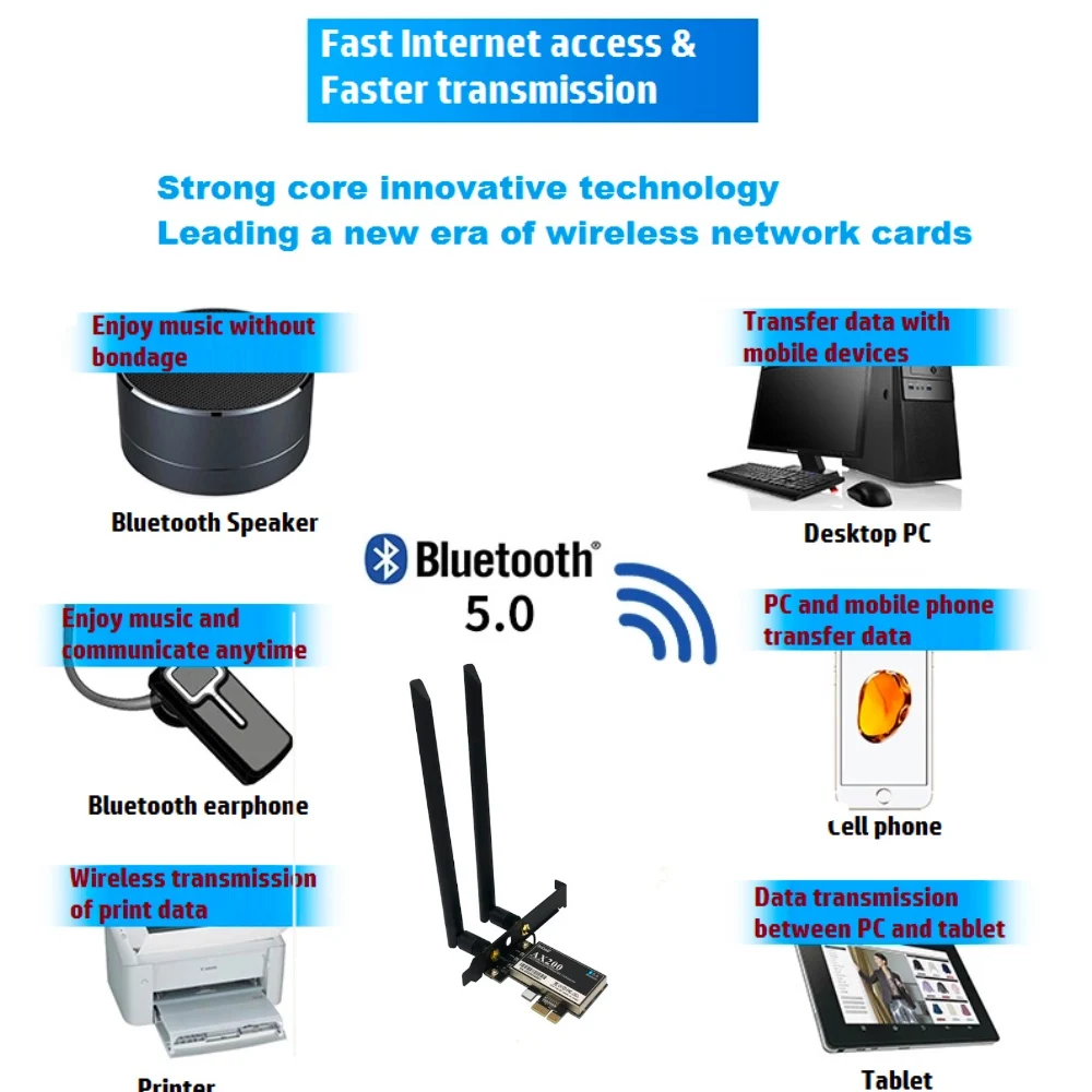 Высокоинтегрированный и экономичный беспроводной адаптер, который обеспечивает интерфейс PCI Express и полное соответствие стандартам IEEE802.11ax и IEEE802.11a/b/g/ac. Скорость беспроводной передачи данных может достигать до 3000 Мбит/с. С помощью беспроводного настольного адаптера PCI-E EP-9636GS вы можете не только подключить ваш настольный компьютер к высокоскоростной сети Wi-Fi, но и работать с более быстрой передачей файлов и высокоскоростным просмотром Интернета с дальнего расстояния по всему дому, чем что в технологии беспроводного n предыдущего поколения, Но также вы можете наслаждаться высокопроизводительным беспроводным просмотром HD мультимедиа и онлайн-военной игрой в реальном времени, когда адаптер PCI-E работает в режиме 11ac 5G. Этот настольный адаптер PCI-E является лучшим выбором для пользователей настольных компьютеров, которые хотят наслаждаться лучшей беспроводной производительностью и высокоскоростным Wi-Fi. Модуль Intel Wi-Fi 6 AX200 может обеспечить гигабитную беспроводную speed2 и значительно улучшить ваш опыт подключения дома, работы или на ходу.