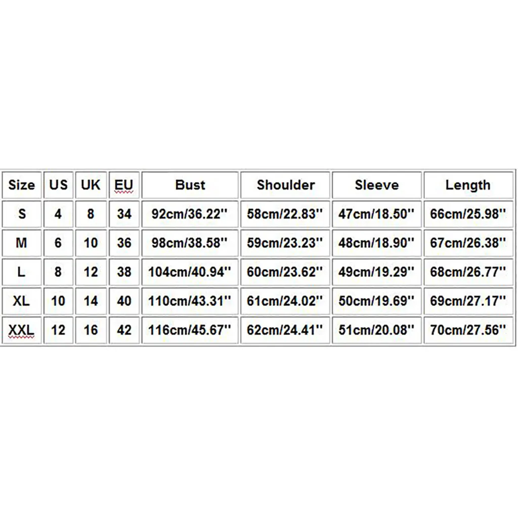 Что вы Получить:1 x женское пальтоРазмер США Великобритания ЕС Бюст Плечо Рукав Длина S 4 8 34 92 см/36,22'' 58 см/22,83'' 47 см/18,50'' 66 см/25,98'' М 6 10 36 98 см/38,58'' 59 см/23,23'' 48 см/18,90'' 67 см/26,38'' L 8 12 38 104 см/40,94'' 60 см/23,62'' 49 см/19,29'' 68 см/26,77'' XL 10 14 40 110 см/43,31'' 61 см/24,02'' 50 см/19,69'' 69 см/27,17'' XXL 12 16 42 116 см/45,67'' 62 см/24,41'' 51 см/20,08'' 70 см/27,56''