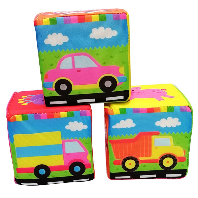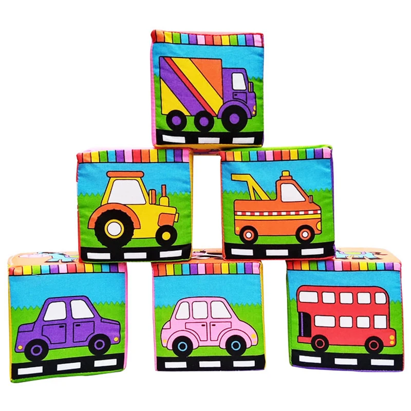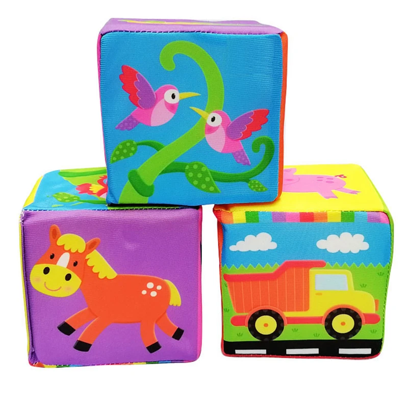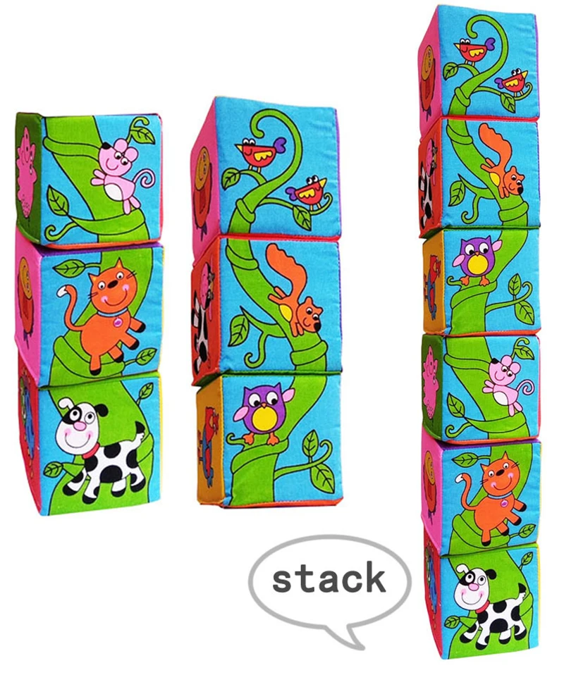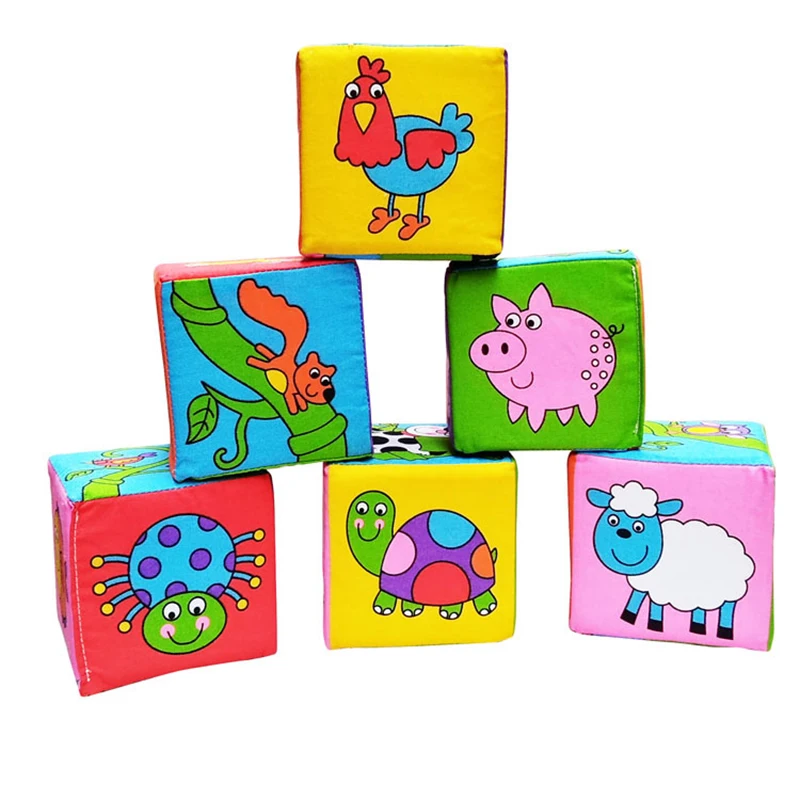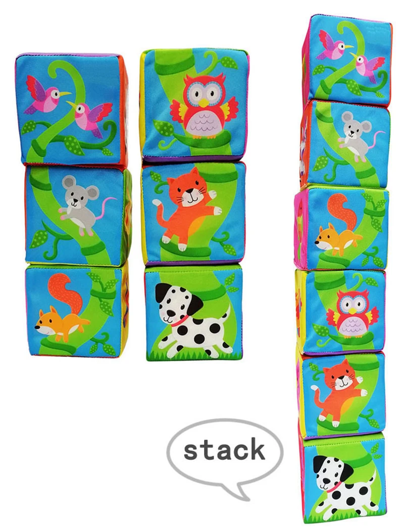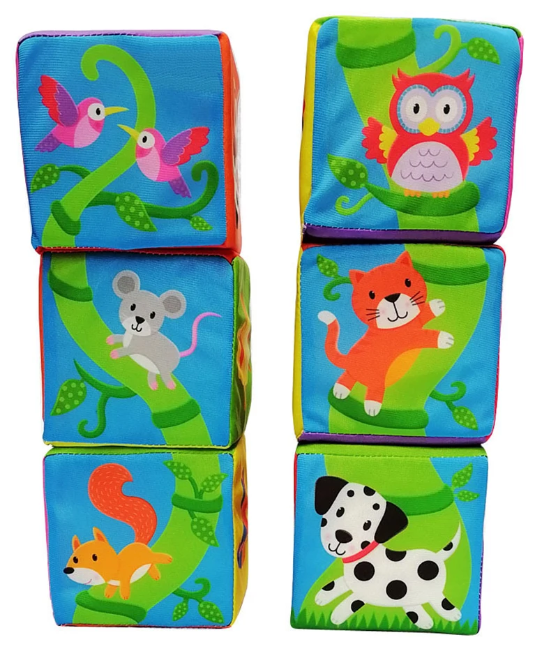 6 foam-filled fabric cubes with colourful animal pictures. Soft and safe, ideal for squeezing, throwing and building. Progress to matching the 12 pairs of animals and joining the animals walking along a path.