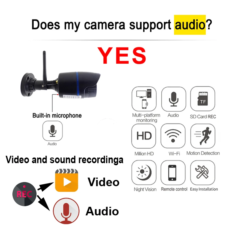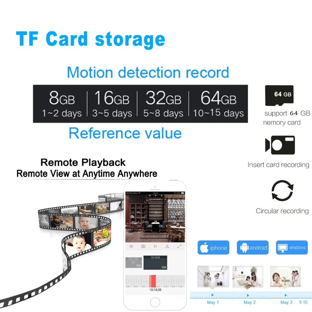 Поддержка записи видео и звука через карту Micro SD или компьютер, вы можете удаленно воспроизводить видео и звук (историю) через мобильное приложение.