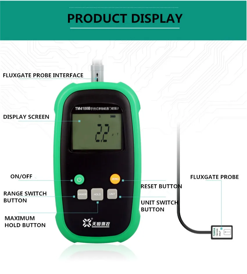 2. One-key unit switching: The value can be selected as magnetic field units such as μT (micro special) and mG (milli Gauss).