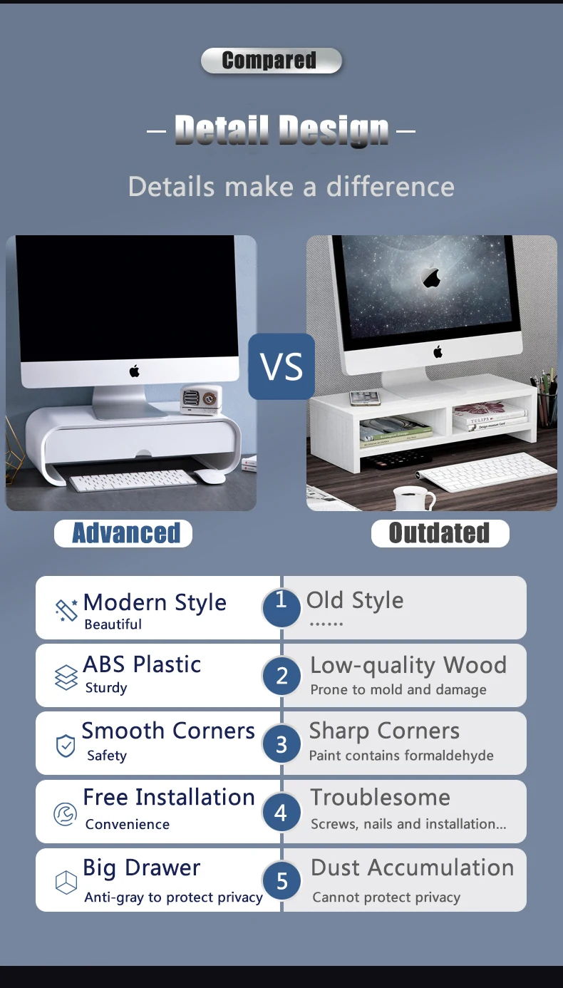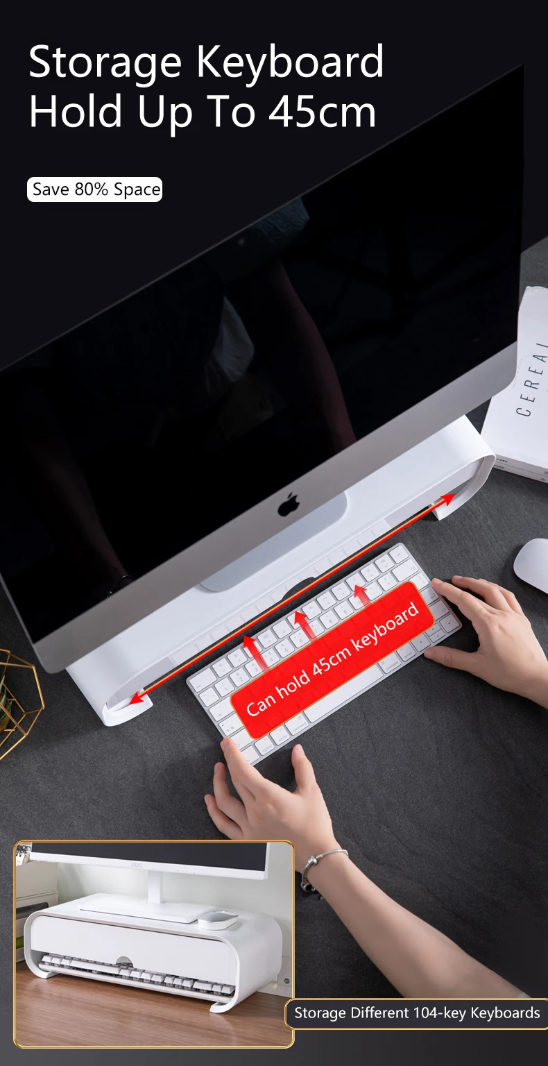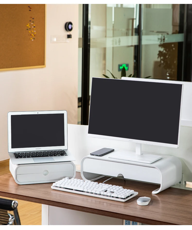 Уникальный и умный дизайн, есть два ящика или один Улучшенный ящик соответственно. Усовершенствованные 4 противоскользящие накладки обеспечивают стабильность. 1 используется для размещения мобильный телефон, поворота управления кабелем и слайдера компактной клавиатуры ниже. Наша подставка для монитора приносит вам аккуратный стол дома/офиса/гостиной/спальни. Он очень подходит для использования в качестве настольной подставки, подставки для принтера, подставки для ноутбука или подставки для компьютера.
