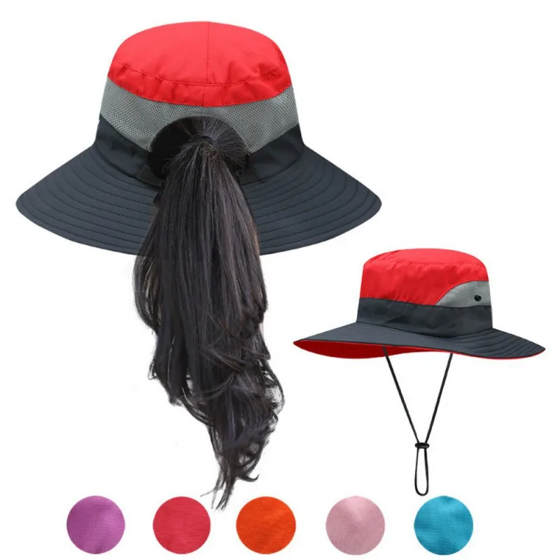 Солнцезащитная шляпа с конским хвостом для женщин, уличная защита от ультрафиолета, складная сетка, дышащая, с широкими полями, для рыбалки, пляжная кепка для женщин на открытом воздухе
